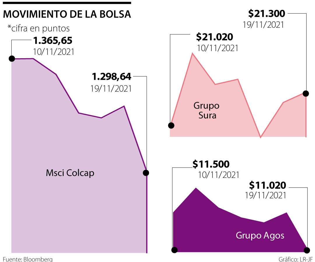 En el caso del Grupo Argos, su cotización ha bajado 4,17% a $11.020, mientras que el Grupo Sura ha ganado 1,33% a $21.300 cada una