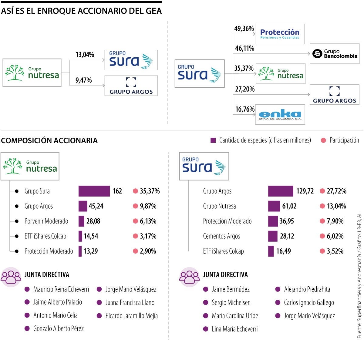 Argos, Nutresa y Sura conforman el llamado Grupo Empresarial Antioqueño, GEA, una estructura diseñada desde 1919 por los empresarios de Medellín con participaciones accionarias cruzadas para blindar su control. Y según ha declarado el banquero Gilinski, ni Argos ni Nutresa han proporcionado a sus accionistas los rendimientos que deberían en 10 años.