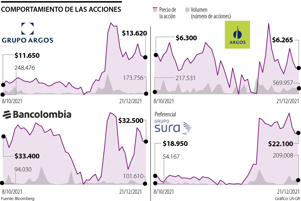 La acción de Argos ha disminuido 13,77%, mientras que la de Bancolombia ha caído 5,89%. Desde su reanudación, Sura ha crecido 14%,