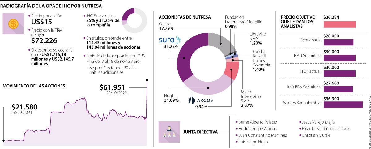 “Si uno entra a mirar en la página del registro de valores, hay unas porciones pequeñas que tienen algunas empresas que se clasifican como el flotante. Un 7% u 8% de ese porcentaje son esas compañías donde los dueños son antioqueños, como la familia Palacio, que probablemente no va a vender, porque así sea que el precio que ofrezcan sea de $100.000, lo que les interesa es mantener algo de propiedad dentro de Nutresa”, dijo Valeria Álvarez, analista senior de acciones de Itaú Comisionista de Bolsa.