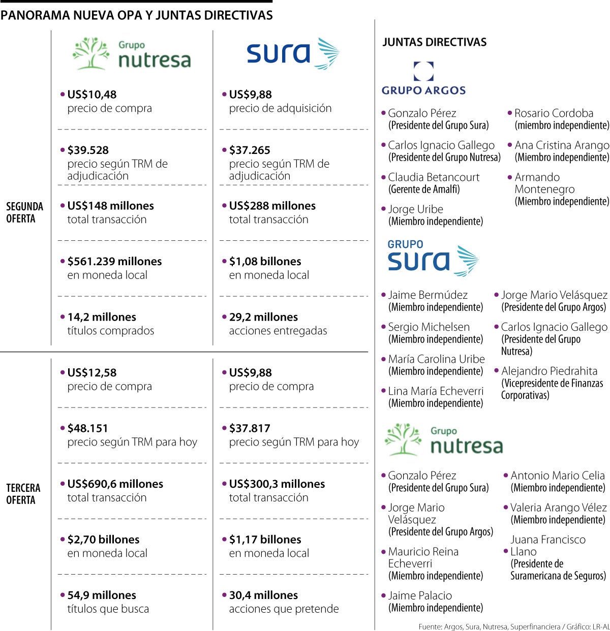 De cumplir la meta de las nuevas propuestas, el oferente pasaría a tener 38,1% en Sura; y en Nutresa completaría 42,8%, posicionándolo como el líder de dicha compañía, aunque sin una posición controlante.