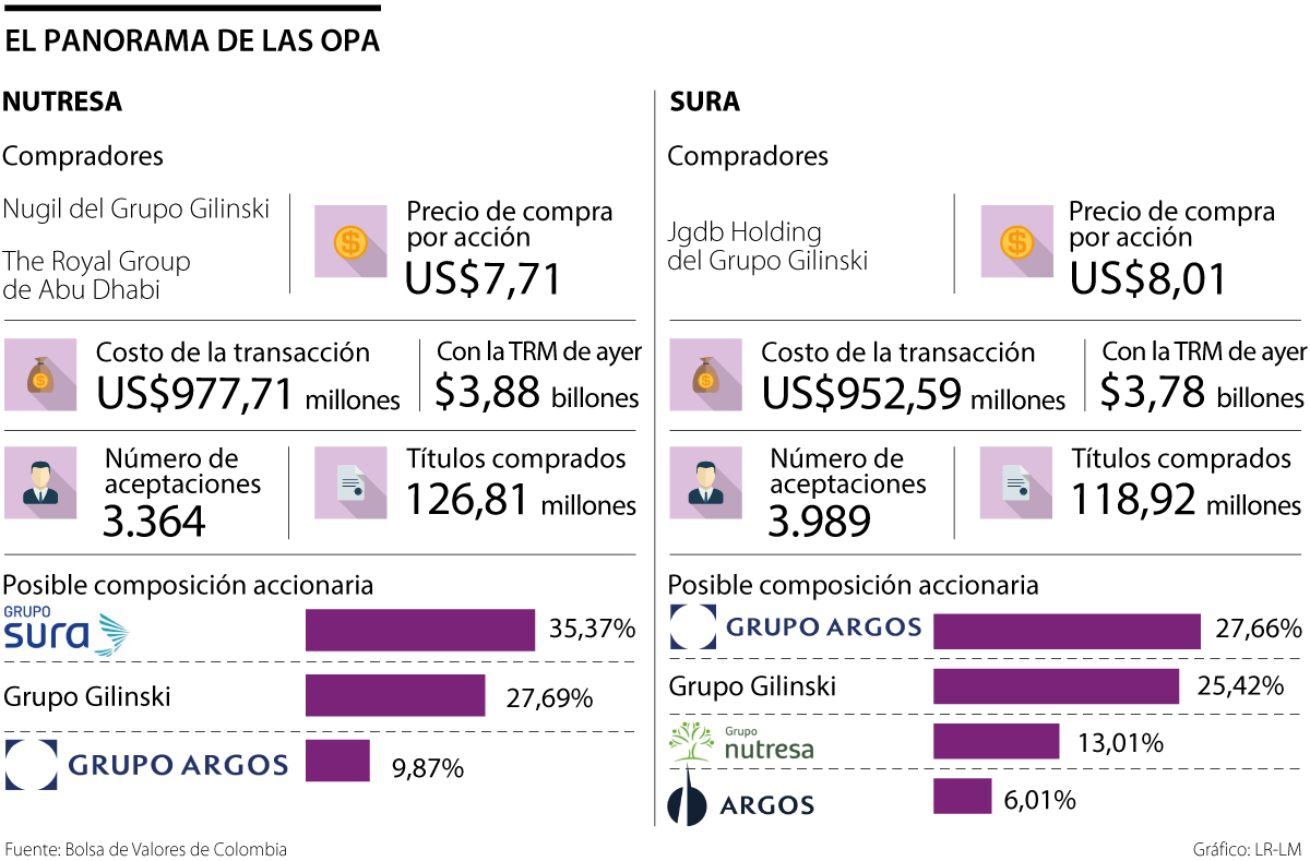La compra de Sura y Nutresa sería la segunda adquisición mediante OPA más grande de los últimos 20 años, detrás de la efectuada sobre Bavaria. Esta última tuvo un costo de más de US$7.200 millones, mientras que la suma de los más reciente negocios sobrepasa los US$1.930 millones.