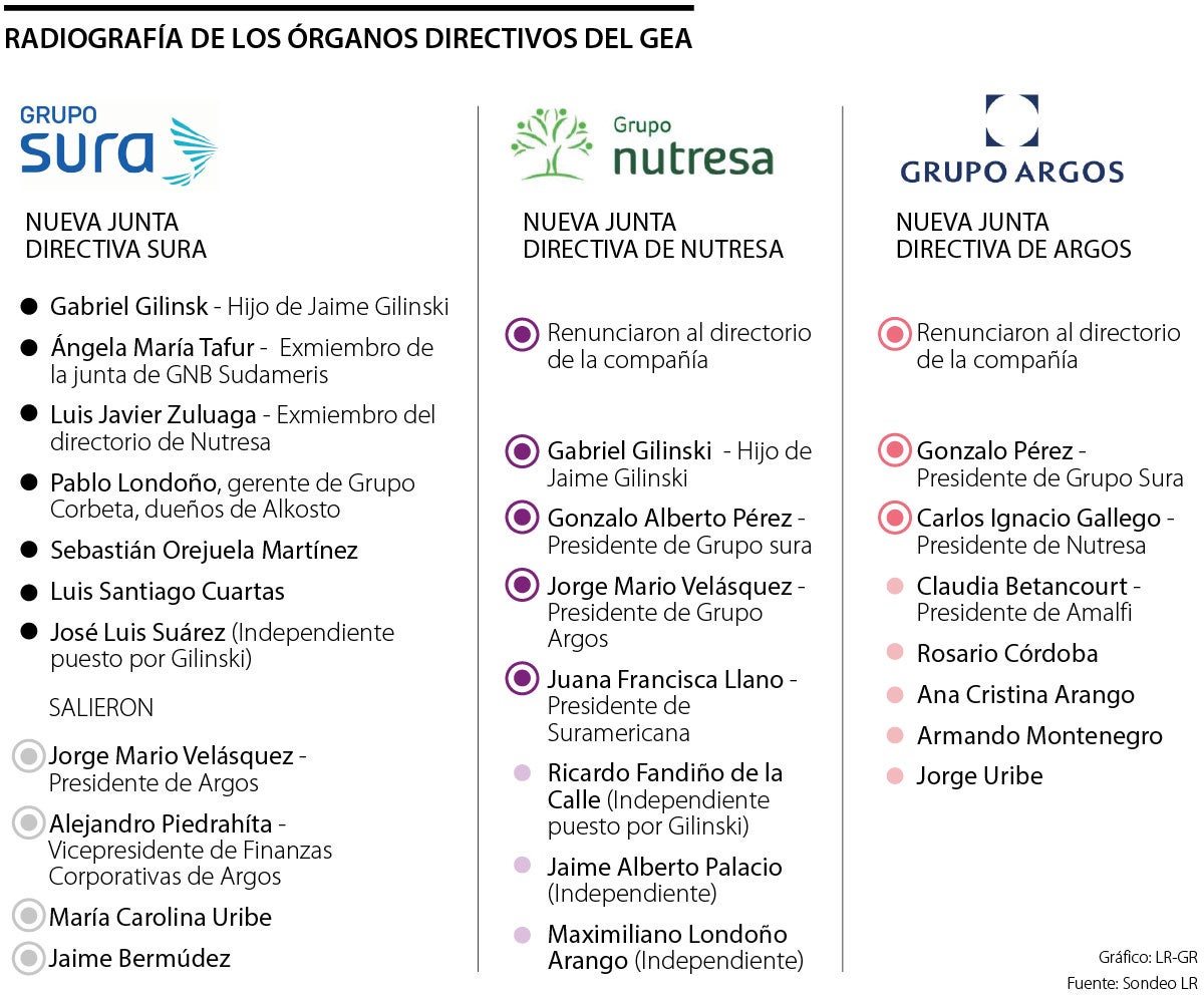 Gradualmente, la batalla por el poder al interior del Grupo Empresarial Antioqueño (GEA) ha migrado del mercado público al gobierno corporativo de las principales empresas que conforman dicho consorcio paisa. Muestra de ello es que a lo largo de las últimas dos semanas renunciaron a las juntas directivas de las diferentes empresas Jorge Mario Velásquez, presidente de Argos; Alejandro Piedrahíta, vicepresidente de Finanzas Corporativas de la misma empresa; Gonzalo Pérez, presidente de Sura; Carlos Ignacio Gallego, presidente de Nutresa y Juana Francisca Llano, presidente de Suramericana.