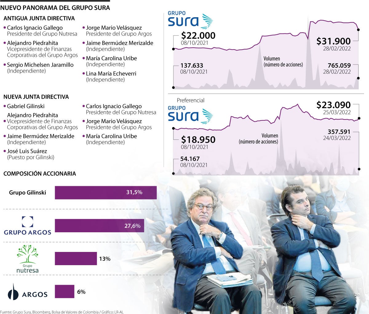 Tras realizar el conteo de rigor para conocer la composición del nuevo órgano directivo, la Junta elegida para ejercer hasta 2024 es la siguiente: Gabriel Gilinski, miembro del Grupo Gilinski; Jorge Velásquez, presidente del Grupo Argos; Alejandro Piedrahíta, vicepresidente de Finanzas Corporativas de Grupo Argos y Carlos Ignacio Gallego, presidente del Grupo Nutresa.