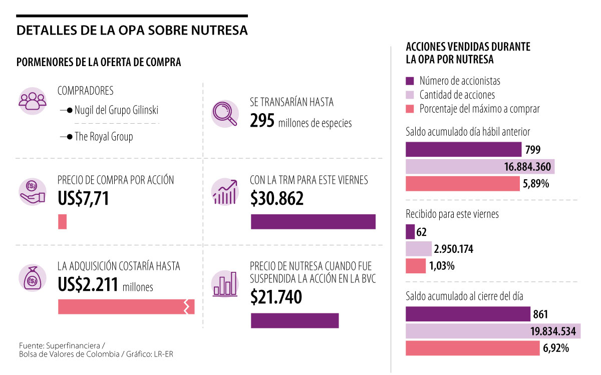 La semana cerró con 861 aceptaciones de la OPA por el Grupo Nutresa, lo cual equivale a 19,83 millones de especies o 6,92% del máximo que busca Nugil (62,62%). Con estas cifras, y teniendo en cuenta que lo mínimo que necesita el socio de una empresa para participar y asegurar un puesto en el proceso de votación que escoge los altos cargos es 25%, Jaime Gilinski estaría a 20,67% de obtener una silla en la Junta Directiva de la compañía de alimentos.