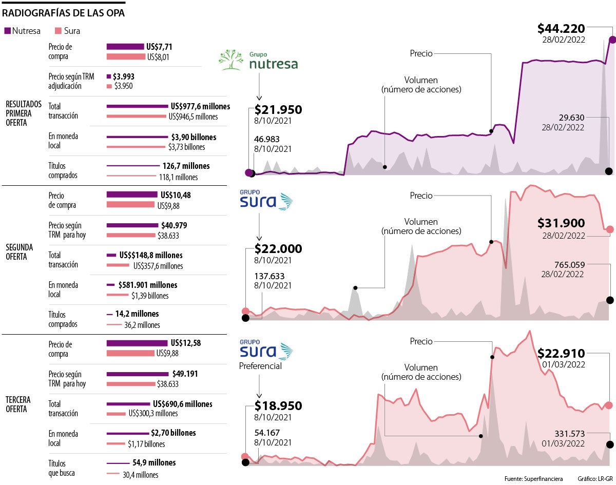 La nueva propuesta por Inversiones Suramericana busca entre 5,2% y 6,5%, pagando un total de US$9,88 por cada título, mismo valor que había ofrecido en la segunda OPA lanzada por el mismo emisor. Sin embargo, en el caso de Nutresa, Gilinski aumentó la oferta a US$12,58, para quedarse con un máximo de 12% adicional. La oferta que cerró a inicio de semana ofrecía US$10,48 por las mismas acciones.