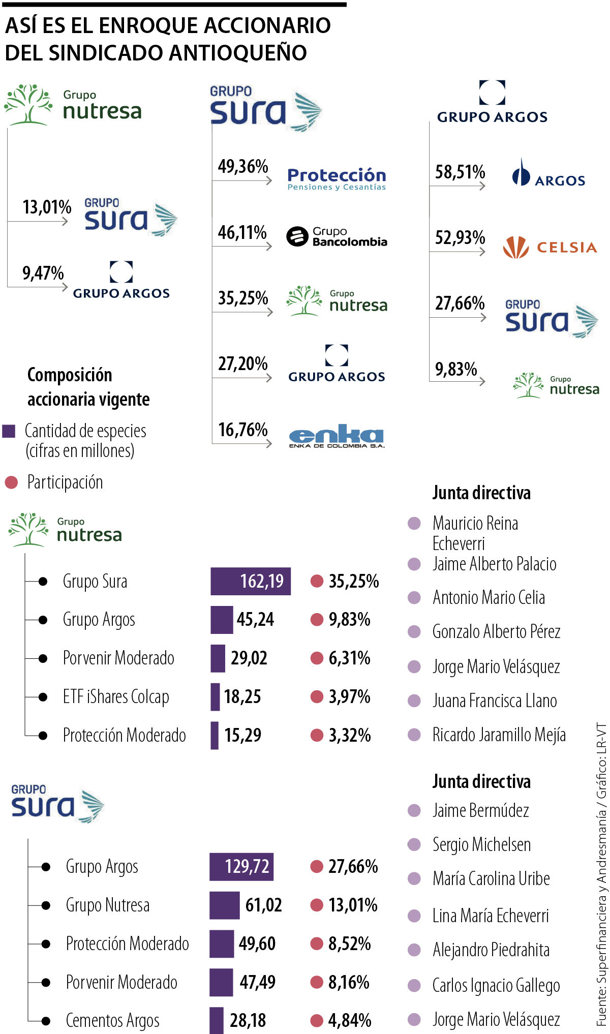 Esto sería posible gracias a que Nutresa tienen 13,04% de Sura y 9,47% de Argos. Además, el Grupo Sura tiene 16,76% de Enka de Colombia, 27,20% de Argos, 35,37% de Nutresa, 46,11% de Bancolombia y 49,36% de Protección.