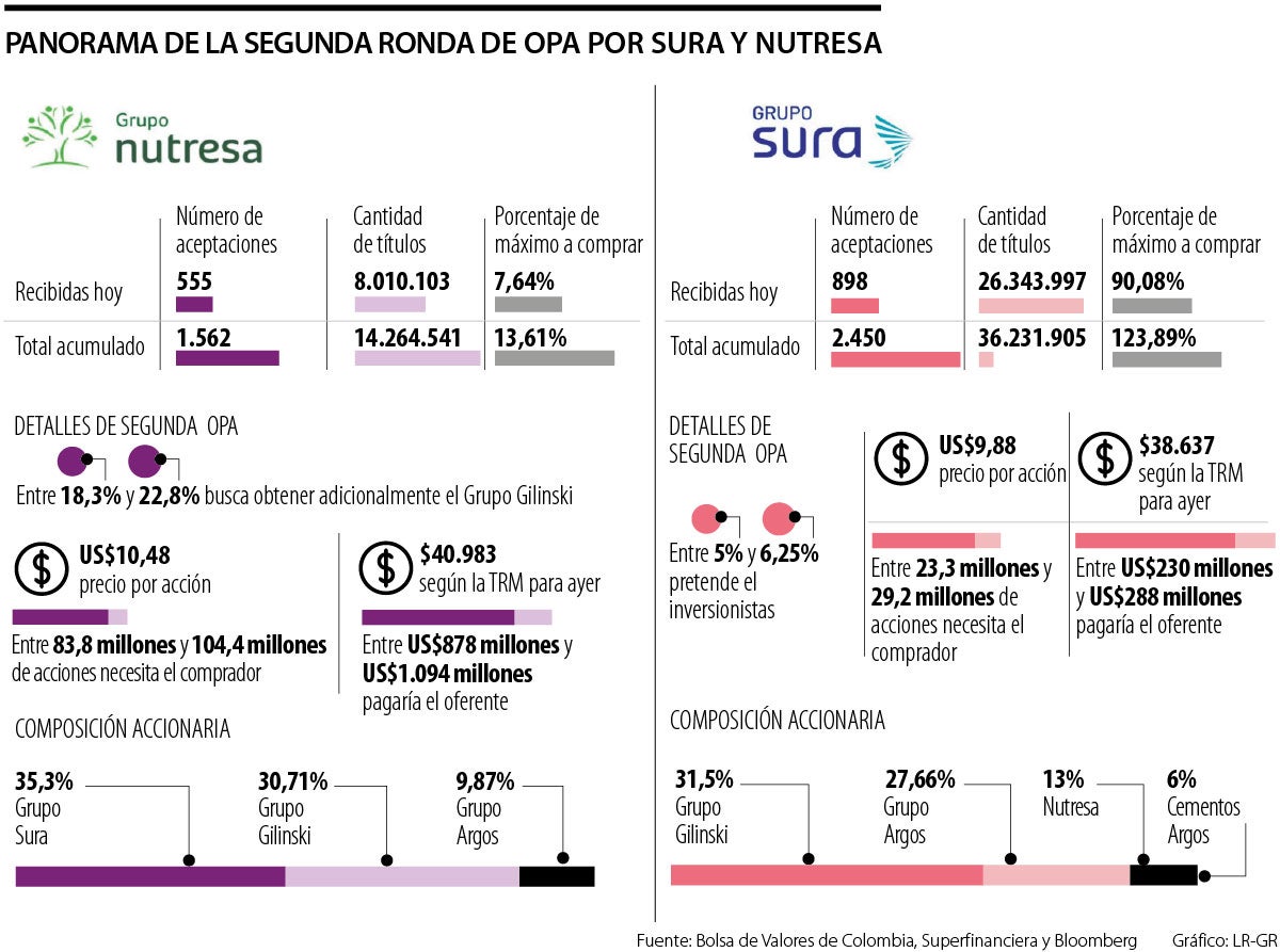 Tras el cierre del periodo de aceptación del segundo set de OPA presentadas por el Grupo Gilinski para quedarse con un porcentaje adicional en Nutresa y Sura, la Bolsa de Valores de Colombia (BVC) tiene hasta cinco días calendario para revisar, verificar y adjudicar las acciones que se vendieron entre enero y febrero. Cumplido este requisito, el oferente desembolsará el dinero de la cantidad entregada a cada uno de los vendedores de los títulos. Cada uno decidirá si dicho pago se hará efectivo en una cuenta local o extranjera, bien sea en dólares o pesos colombianos.