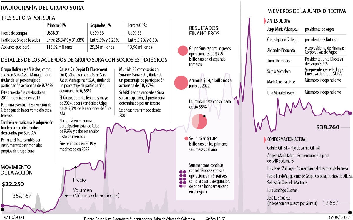 El empresario caleño es el mayor accionista de Grupo Sura con una participación de 38%, pero esto fue posible tras presentar tres set de OPA, consiguiendo 118,92 millones de acciones en la primera, 29,24 millones en la segunda y 13,96 millones en la última. En cuanto al movimiento accionario, para noviembre de 2021 la especie tocaba los $22.250 y al cierre de ayer llegó a $38.760 en la Bolsa de Valores de Colombia (BVC), lo cual representa un aumento de 74,2% desde que Jaime Gilinski inició su jugada por las compañías del Grupo Empresarial Antioqueño (GEA).