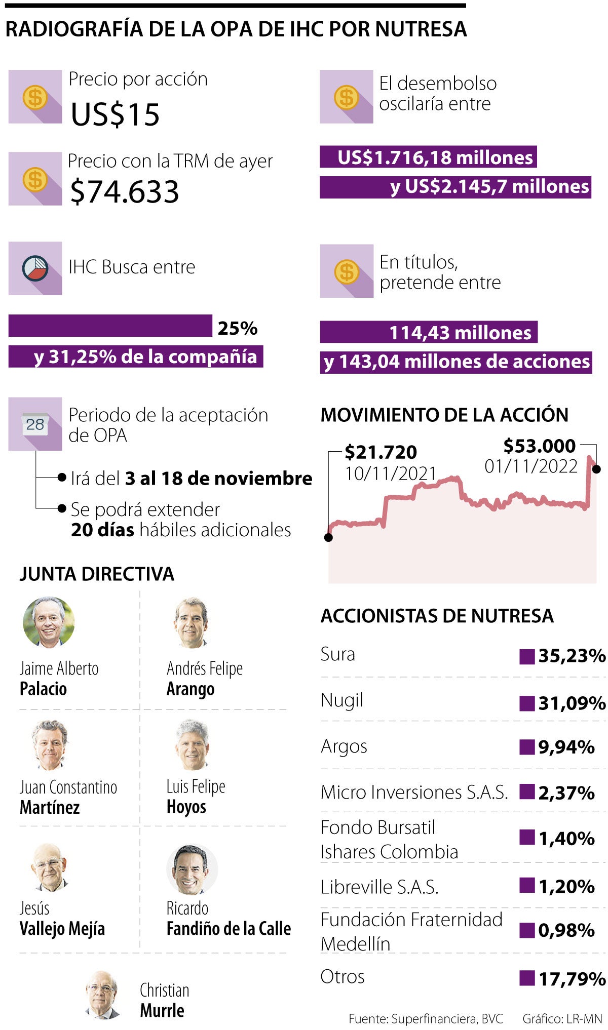 De alcanzar la participación que busca en Nutresa, IHC desembolsaría entre US$1.716,18 millones y US$2.145,7 millones, mientras que en moneda local sería entre $7,9 billones y $9,9 billones. Sin embargo, el oferente podrá modificar los mínimos de la compra, si no llega a, por lo menos, el 25% que pretende, o la OPA podría declararse desierta.