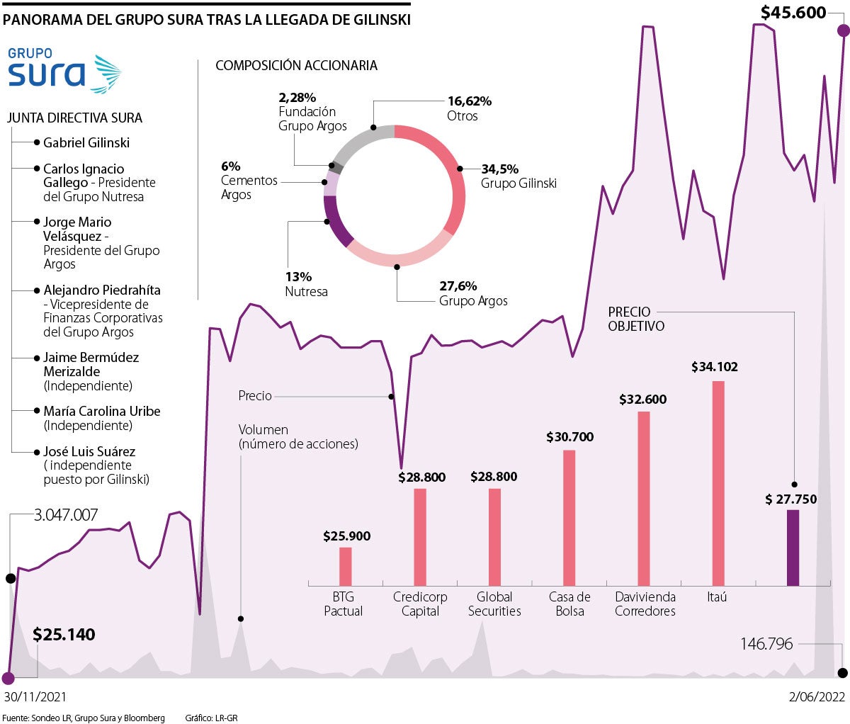 De consolidar su mayoría en el Grupo Sura tras la compra en el mercado público de hasta 5% de las acciones en circulación, el Grupo Gilinski podría buscar sumar una silla adicional a las dos que ya ostenta en la Junta Directiva de la compañía. Hasta el momento, en el directorio están Gabriel Gilinski y José Luis Suárez Parra.