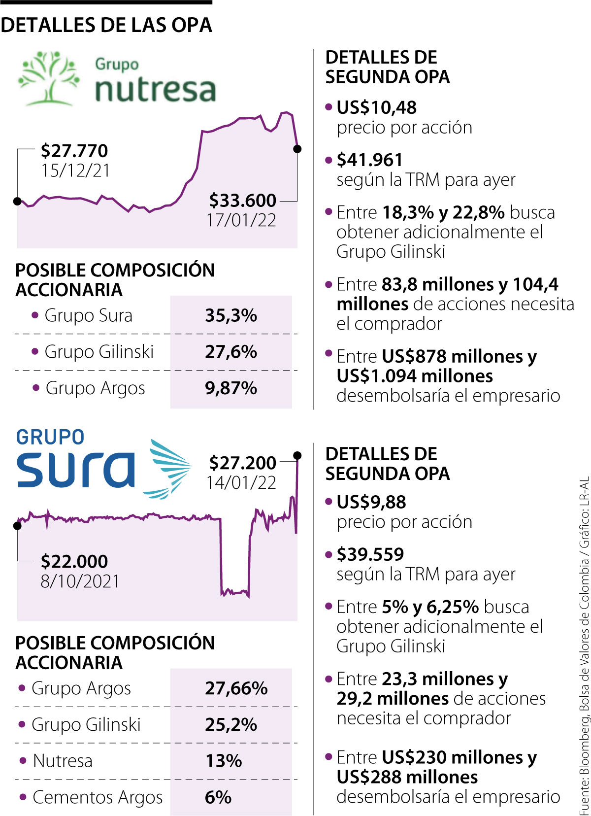 En el caso del Grupo Argos, si vendiera la totalidad de sus acciones en ambas empresas, vería entrar en sus cuentas más de US$1.755 millones, esto suponiendo que Gilinski aceptase un porcentaje mucho mayor al que pretende. En el caso de Nutresa, esta podría recibir hasta US$602 millones, mientras que Sura tendría la opción de beneficiarse con US$1.697 millones.