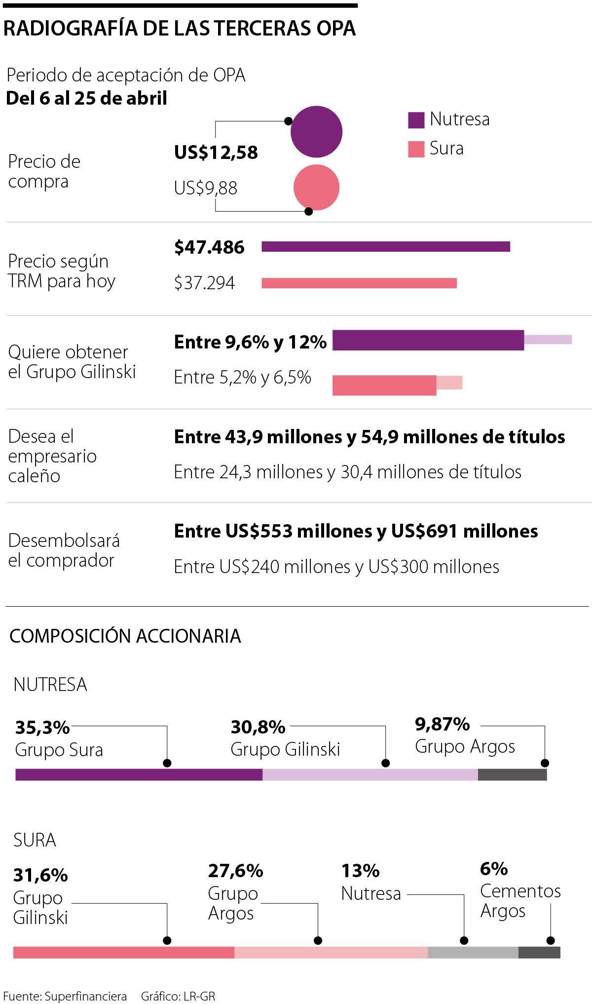 Gilinski tiene 30,8% en Grupo Sura y 31,6% en Grupo Nutresa, lo cual le da un poder indirecto y parcial en Grupo Argos, Bancolombia, AFP Protección, Enka de Colombia y Cementos Argos. Sin embargo, de ser exitoso el proceso, los porcentajes podrían aumentar a 37,3% y 43,6%, respectivamente.