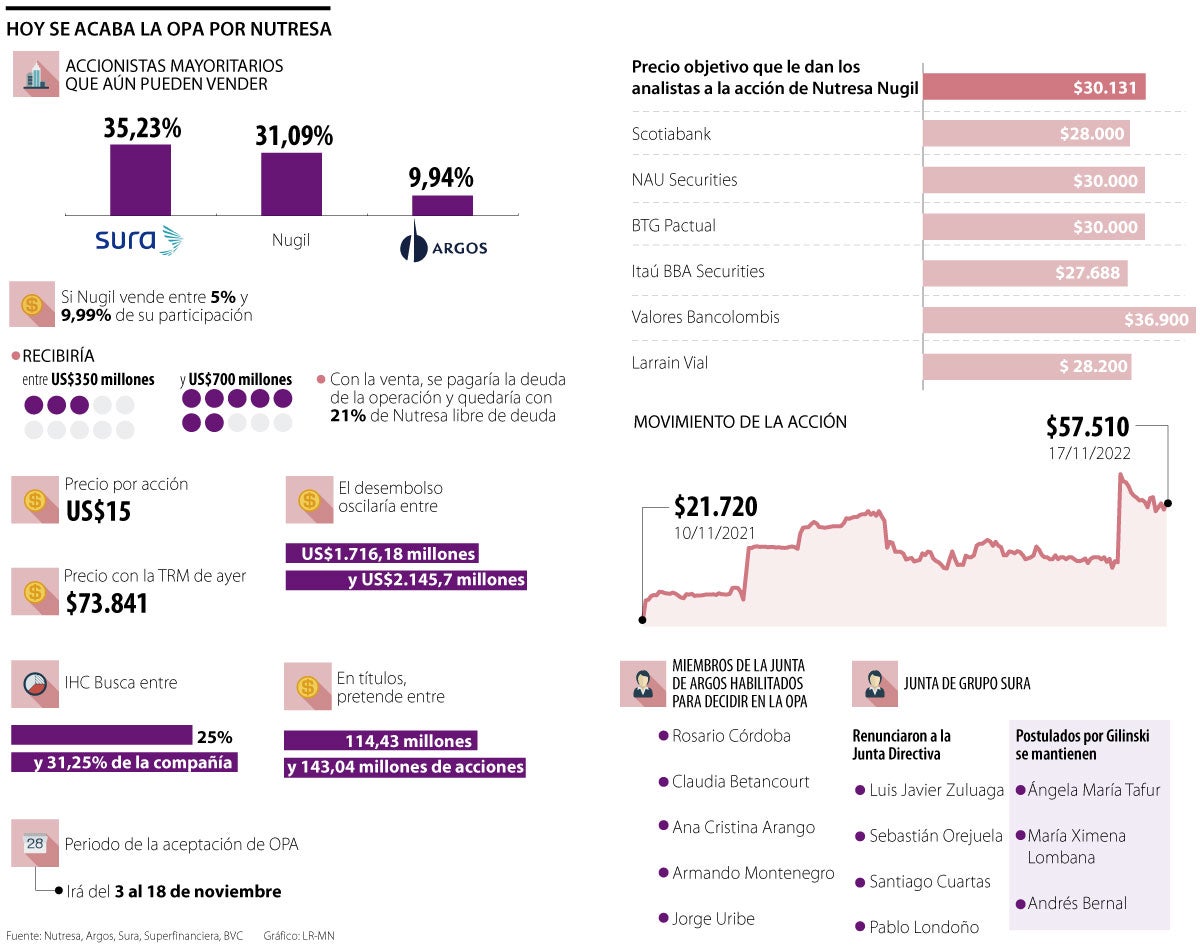Hasta hoy tienen plazo los socios de Nutresa para decidir si salen o no de su participación a través de la OPA; y la decisión de los mayores accionistas, Sura, Nugil, es clave para que la oferta alcance el mínimo y no se declare desierta.
