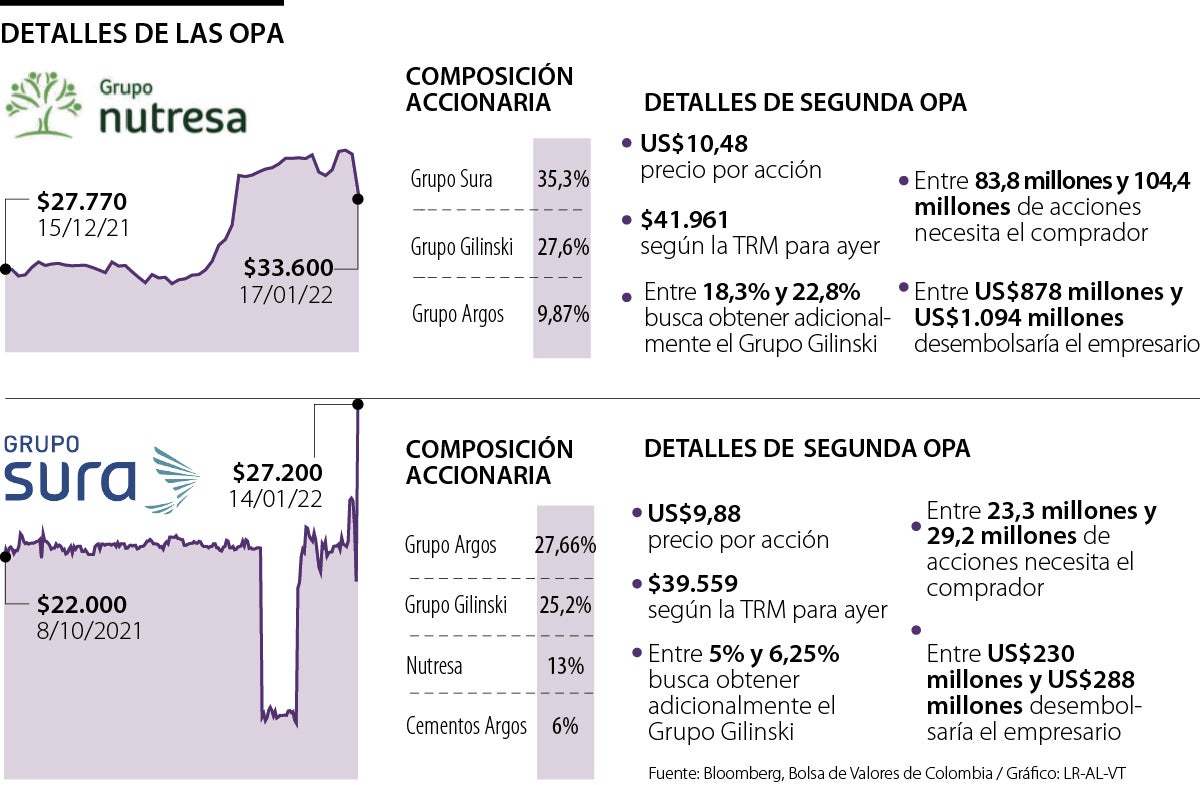 En cuanto a Nutresa, cuya OPA fue autorizada ayer viernes al caer de la noche, la oferta del Grupo Gilinski plantea un precio de US$10,48 por especie. El inversionista buscaría un mínimo de 18,3% y un máximo de 22,8% de las acciones en circulación de la compañía.