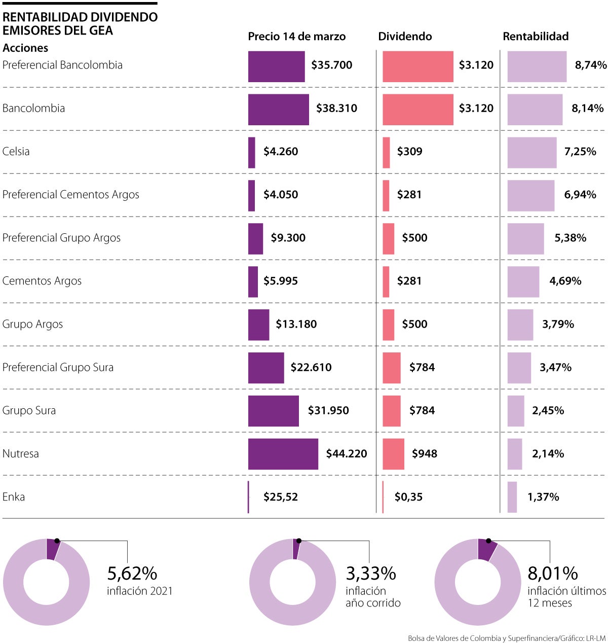 En contraste, entre las que ofrecerán un dividendo por debajo de la inflación del año pasado se encuentran Enka de Colombia, con un rendimiento de 1,37%; Grupo Nutresa, con 2,14%; Grupo Sura, con 2,45%; y preferencial Grupo Sura, con 3,47%.