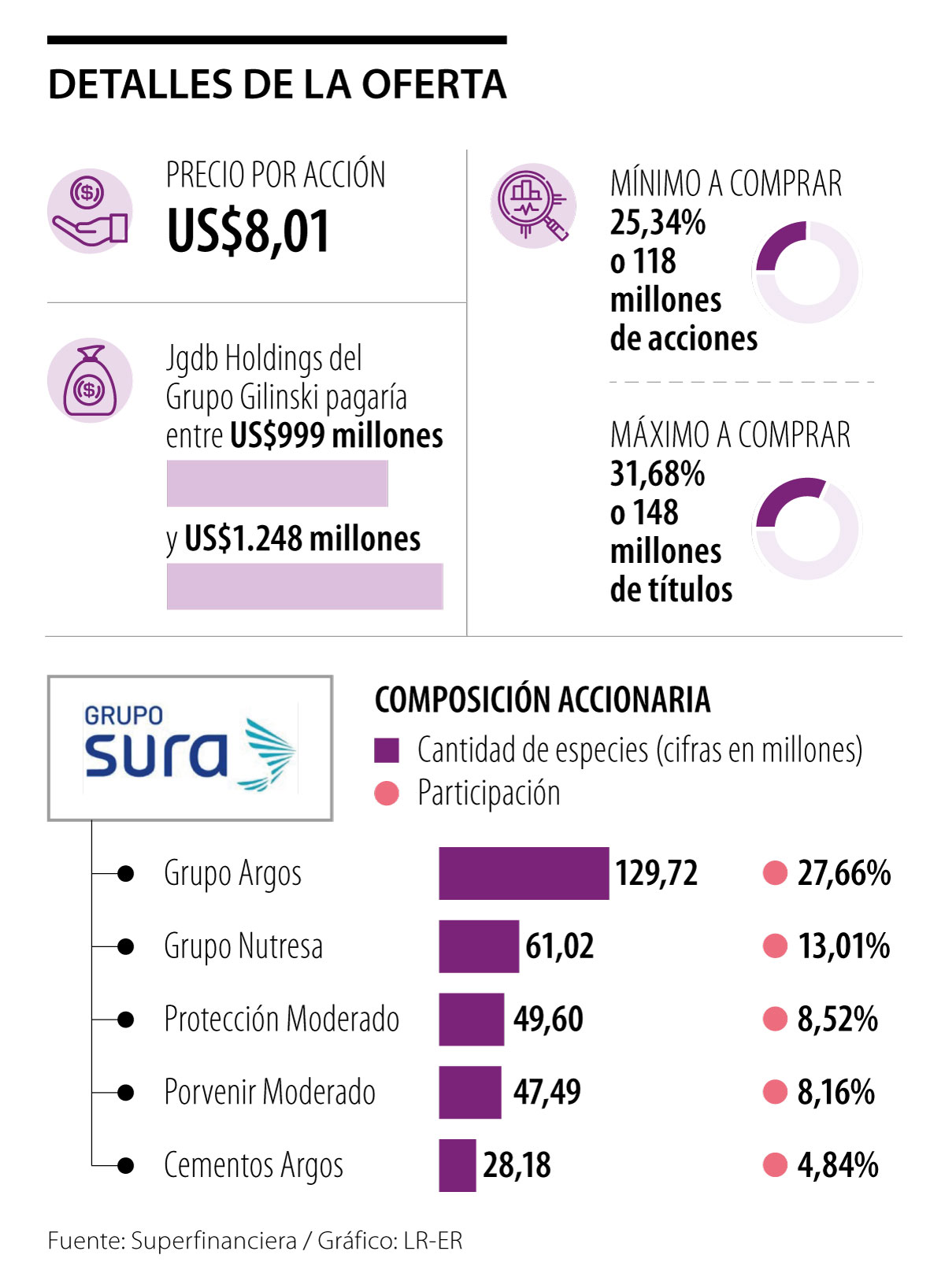 Sin embargo, ante la negativa de vender por parte del Grupo Sura, que tiene 35,37%, y Grupo Argos, con 9,87%, el oferente estaría dispuesto a recibir una cantidad menor, como el mismo reglamento se lo permite.
