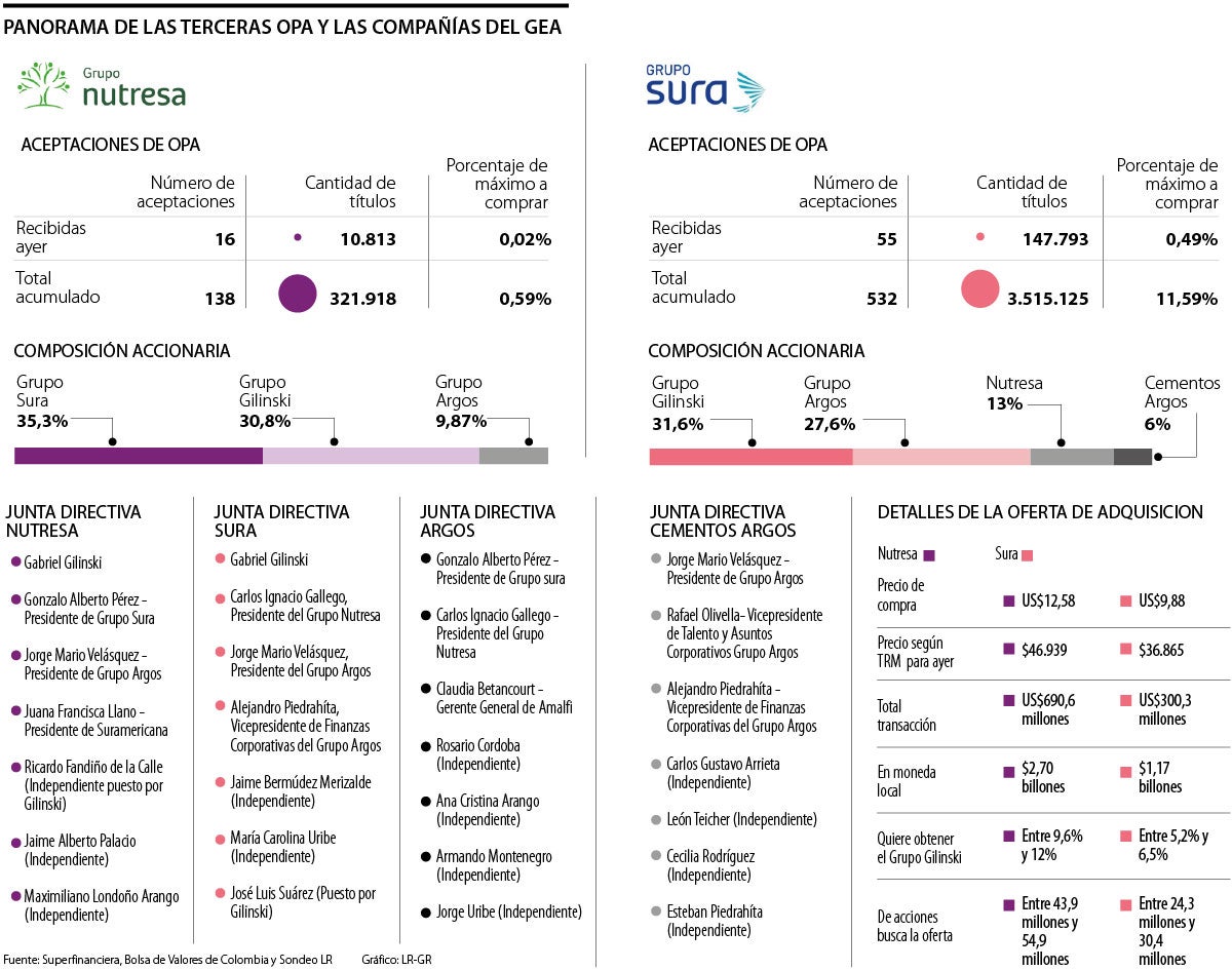 En el octavo día de aceptación de OPA, 55 inversionistas de Sura vendieron 147.793 acciones, para un total de 3,51 millones de especies ofertadas y 11,59% del máximo a adquirir por parte de Jaime Gilinski. Según la Bolsa de Valores de Colombia (BVC), este monto equivale a 0,75% de las acciones ordinarias en circulación de la compañía. En cuanto a Nutresa, un total de 138 socios han decidido dejar sus participaciones, lo que equivale a 321.018 especies y 0,59% del total de lo que aspira comprar el empresario caleño.