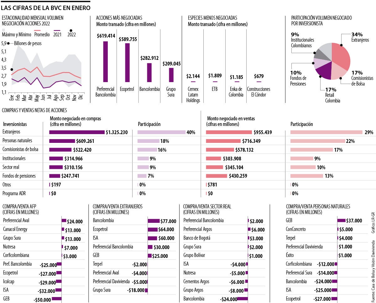 Según informes publicados por Casa de Bolsa, en el primer mes del año, las acciones que más se vieron beneficiadas con este flujo de capital fueron preferencial Bancolombia, con $619.414 millones negociados; Ecopetrol, con $589.755 millones; la especie ordinaria de Bancolombia, con $282.912 millones; y Grupo Sura, con $209.045 millones.