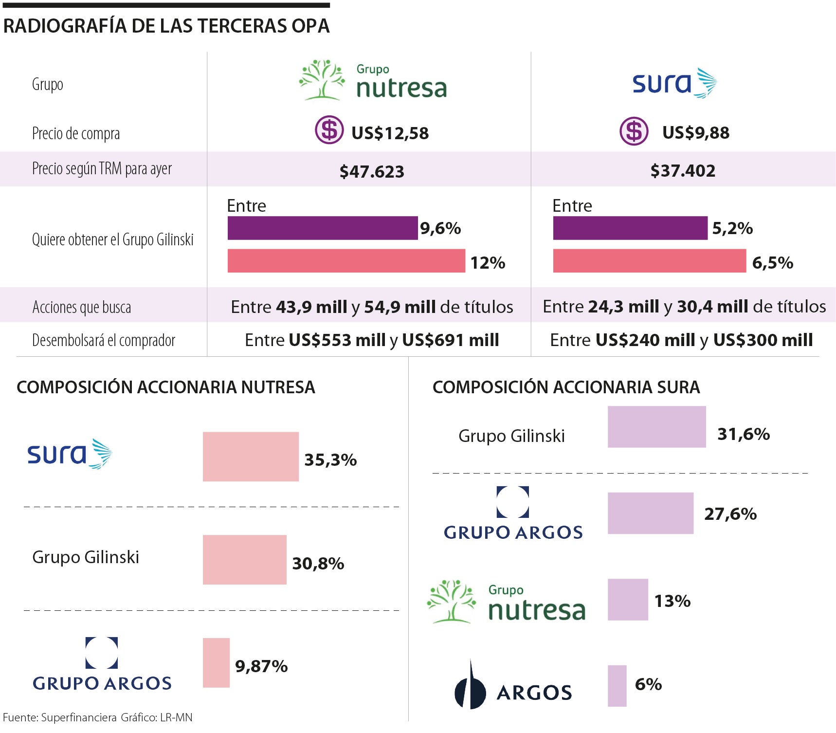 Con estos números sobre la mesa, de completar su objetivo, Jaime Gilinski pasaría de tener 30,8% a 42,8% en la multilatina de alimentos, y de 31,6% a 38,1% en la empresa de seguros e inversiones.