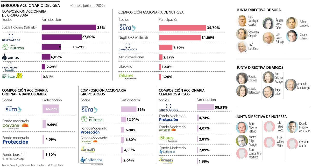 Actualmente, Grupo Sura tiene 36% de participación en Argos y 35% en Nutresa; mientras que la multilatina de alimentos es titular de 12,51% de las acciones ordinarias del conglomerado especializado en cementos y energía; y de 13,29% del holding enfocado en la industria de servicios financieros. Por su parte, Argos cuenta con 9,9% de las acciones de Grupo Nutresa y con 27,6% de las de Sura.