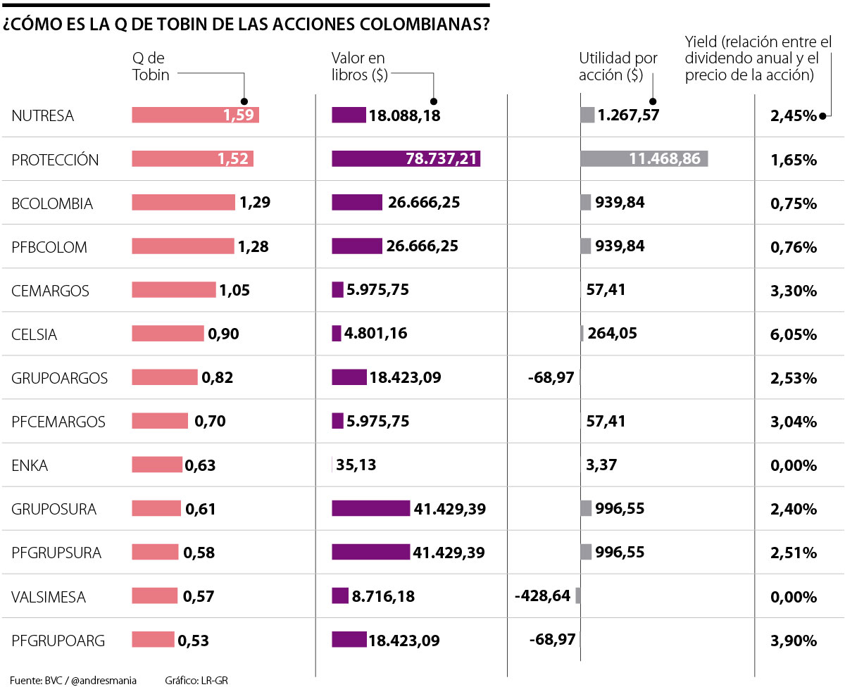 El indicador de Q de Tobin por encima de 1 se repite con Bancolombia (preferencial y ordinaria), Protección y Cementos Argos (ordinaria), acciones que están por encima del valor en libros.