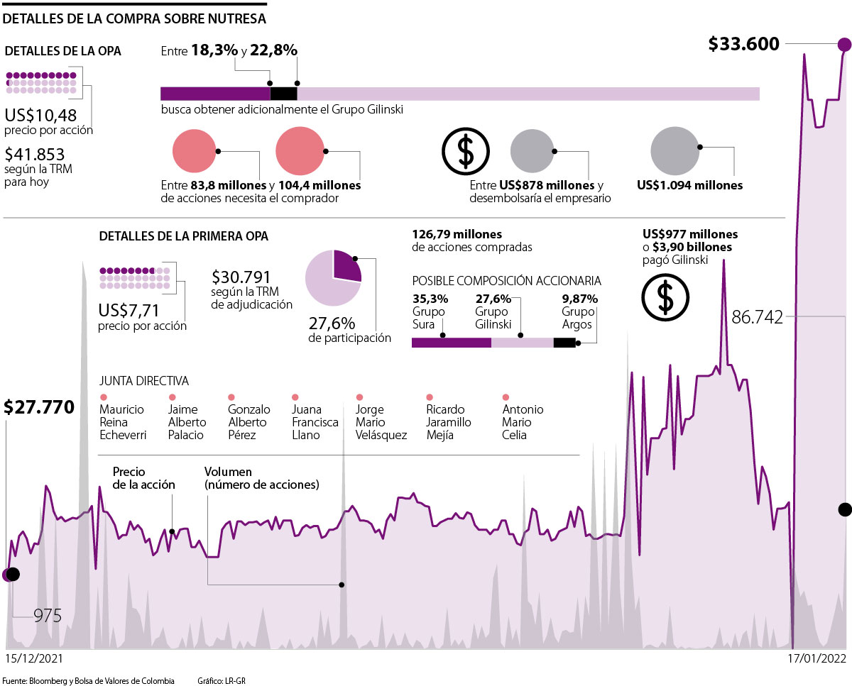 Por ahora se conoce que la solicitud sobre Nutresa busca un mínimo de 18,3% y un máximo de 22,8% de las acciones en circulación de la compañía. Esta tendría un precio de compra de US$10,48 o $41.853 por título, si se tiene en cuenta la tasa de cambio de ayer.