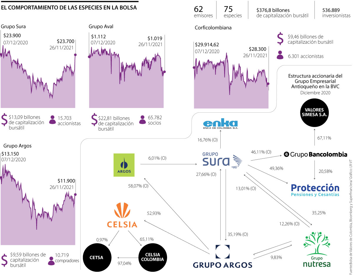 Según analistas del mercado, varias de las fichas clave se encuentran en el GEA, especialmente en compañías como los grupos Argos, Sura y Bancolombia. Uno de los puntos a favor de estas organizaciones es el modelo de enroque que mantienen entre ellas. Hoy, Nutresa tiene 12,6% del Grupo Argos, mientras que este último tiene una participación de 9,83% en la compañía de alimentos.