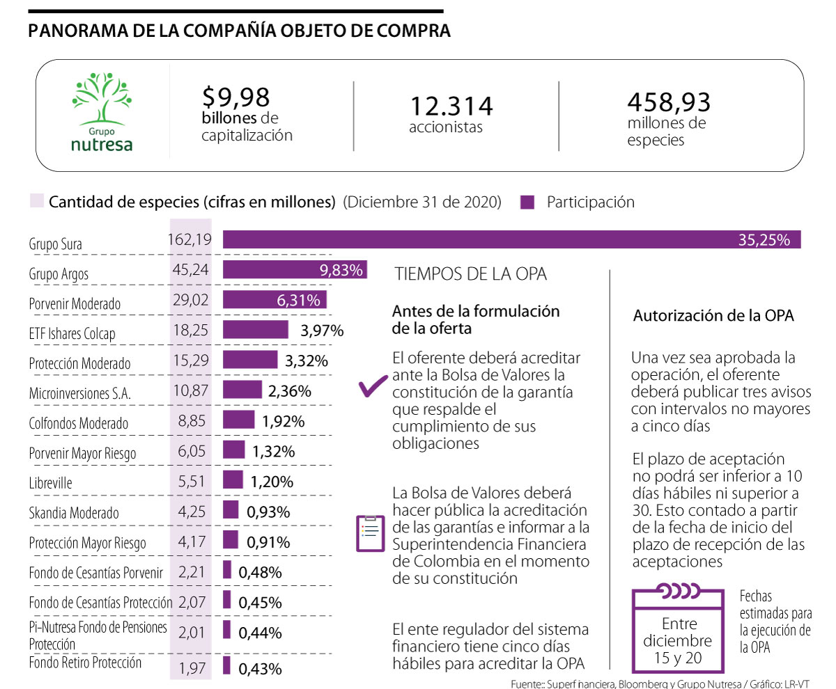 Teniendo presente que el Grupo Sura cuenta con 35,25% de participación en Nutresa y Grupo Argos 9,83%, estas serían las empresas llamadas a realizar la adquisición competitiva, especialmente porque son las que poseen una mayor parte de la compañía de alimentos. Por esa misma razón, no tendrían que lanzarse a buscar el mismo porcentaje que le apetece hoy a Gilinski y a The Royal Group de Abu Dhabi, sino completar la OPA competitiva con el porcentaje que hoy tienen. Pensar en que la compañía objeto de la oferta lleve a cabo una recompra de acciones la dejaría insolvente.