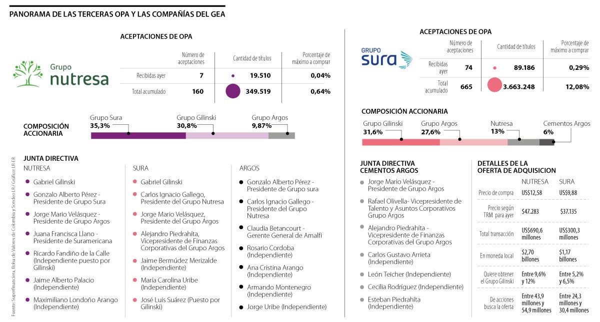En el décimo día de aceptación de OPA, 74 inversionistas del Grupo Sura vendieron 89.186 acciones, lo cual da un total de 3,66 millones de especies ofertadas y 11,78% del máximo a adquirir por parte de Jaime Gilinski. Según la Bolsa de Valores de Colombia (BVC), este monto equivale a 0,77% de las acciones ordinarias en circulación de la compañía. En cuanto al Grupo Nutresa, un total de 160 socios han decidido dejar sus títulos, lo que equivale a 349.519 especies y 0,60% del total de lo que apetece el empresario caleño.