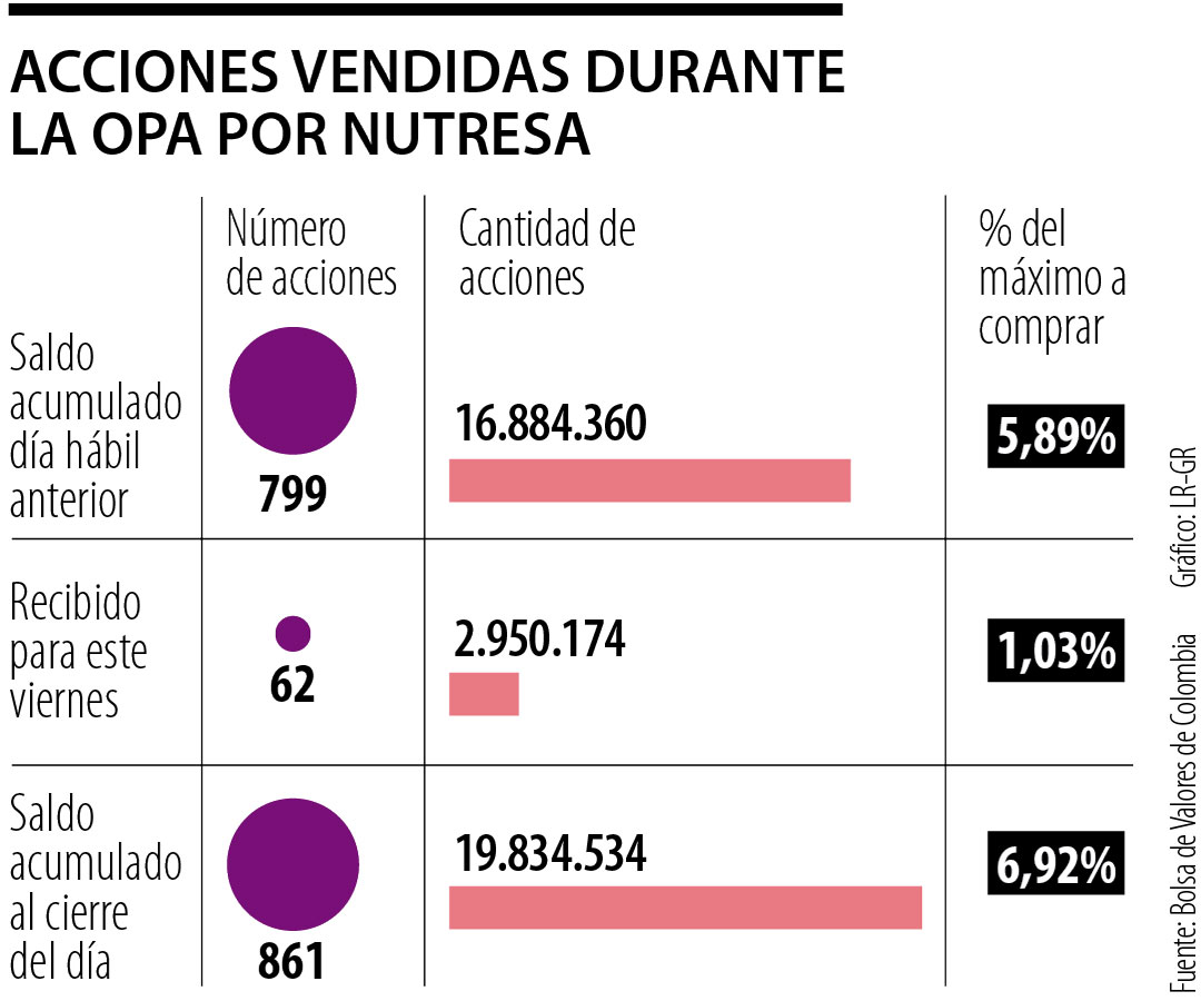 La Bolsa de Valores de Colombia (BVC) reportó la aceptación de 62 nuevas ofertas por los títulos del Grupo Nutresa. Dicha cifra equivale a 2,95 millones de acciones. En total, la cantidad de tenedores de fracciones que han dado el sí asciende a 861, lo que representa 19,83 millones de papeles y 6,92% del porcentaje máximo que busca el Grupo Gilinski.