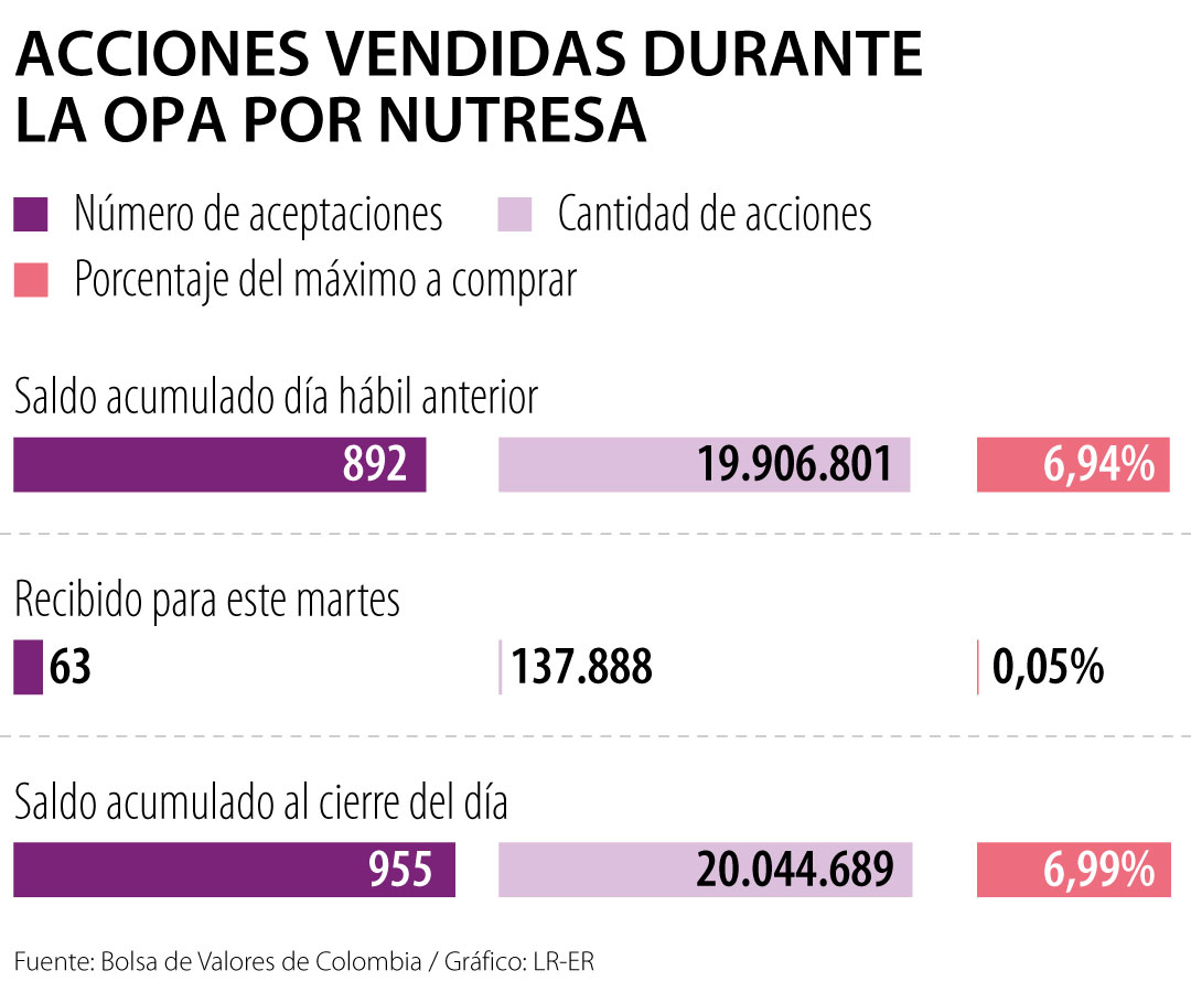 La Bolsa de Valores de Colombia (BVC) reportó la aceptación de 63 nuevas ofertas por los títulos del Grupo Nutresa. Dicha cifra equivale a 137.888 de acciones. En total, la cantidad de tenedores de fracciones que han dado el sí asciende a 955, lo que representa 20,04 millones de papeles y 6,99% del porcentaje máximo que busca el Grupo Gilinski.