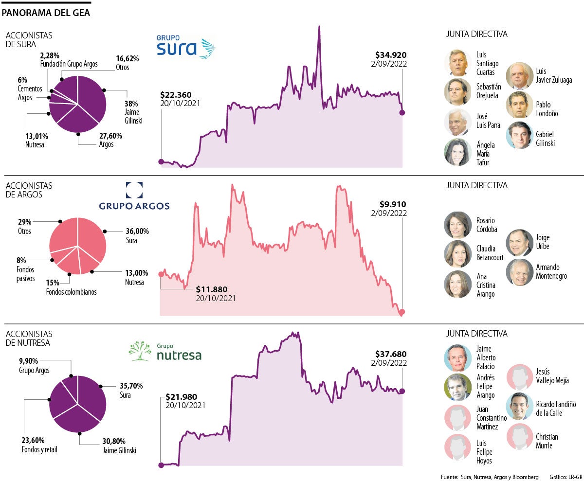 Cabe mencionar que los presidentes de los tres grupos, Carlos Gallego (Nutresa), Gonzalo Pérez (Sura) y Jorge Velásquez (Argos) hacían parte de las Juntas Directivas de las compañías de manera cruzada hasta que renunciaron en junio de este año. En el órgano directivo de Bancolombia no sucede lo mismo.