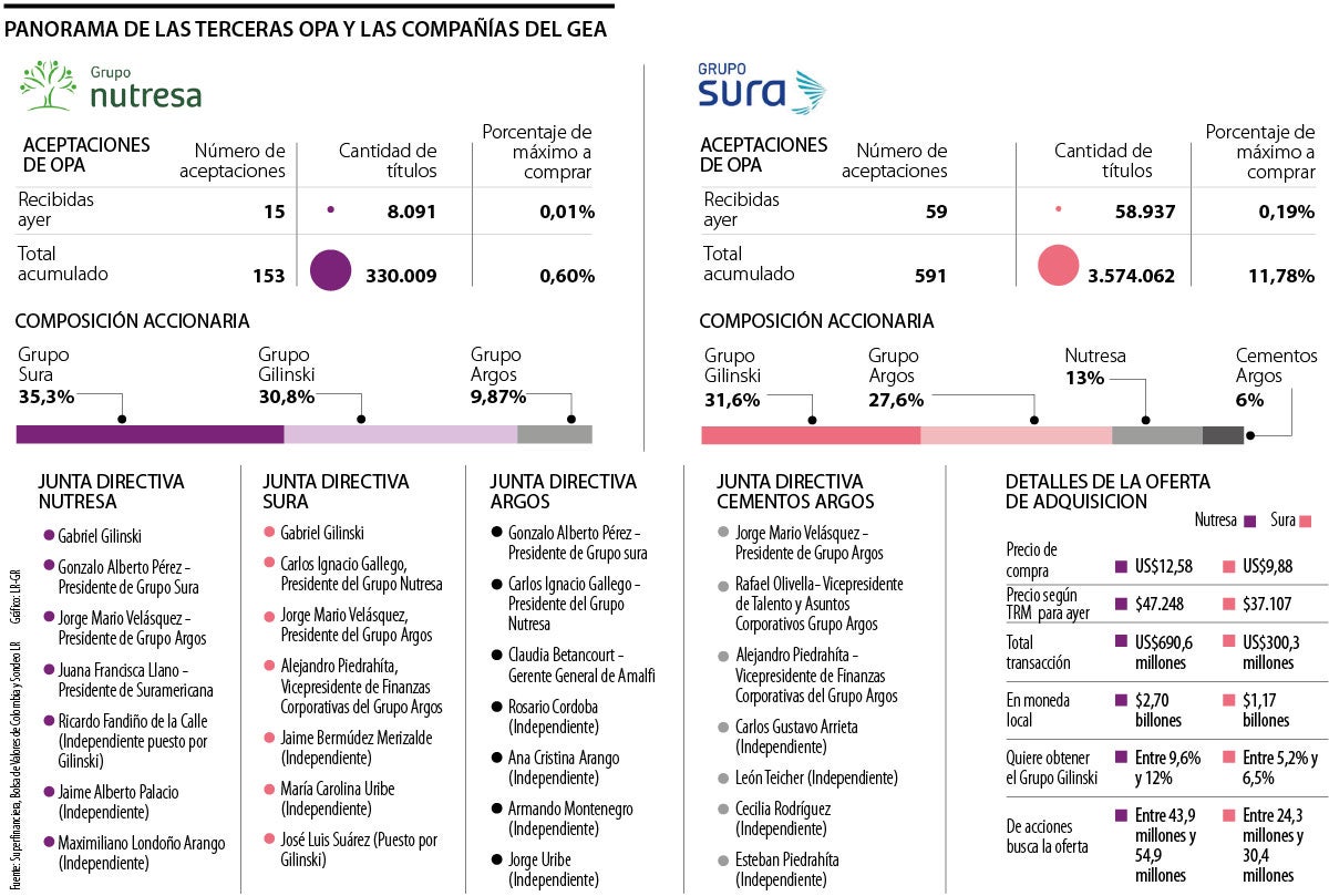 En el noveno día de aceptación de OPA, 59 inversionistas del Grupo Sura vendieron 58.937 acciones, lo cual da un total de 3,57 millones de especies ofertadas y 11,78% del máximo a adquirir por parte de Jaime Gilinski. Según la Bolsa de Valores de Colombia (BVC), este monto equivale a 0,77% de las acciones ordinarias en circulación de la compañía. En cuanto al Grupo Nutresa, en total 153 socios han decidido dejar sus acciones, lo que equivale a 330.009 especies y 0,60% del total de lo que apetece el empresario caleño.