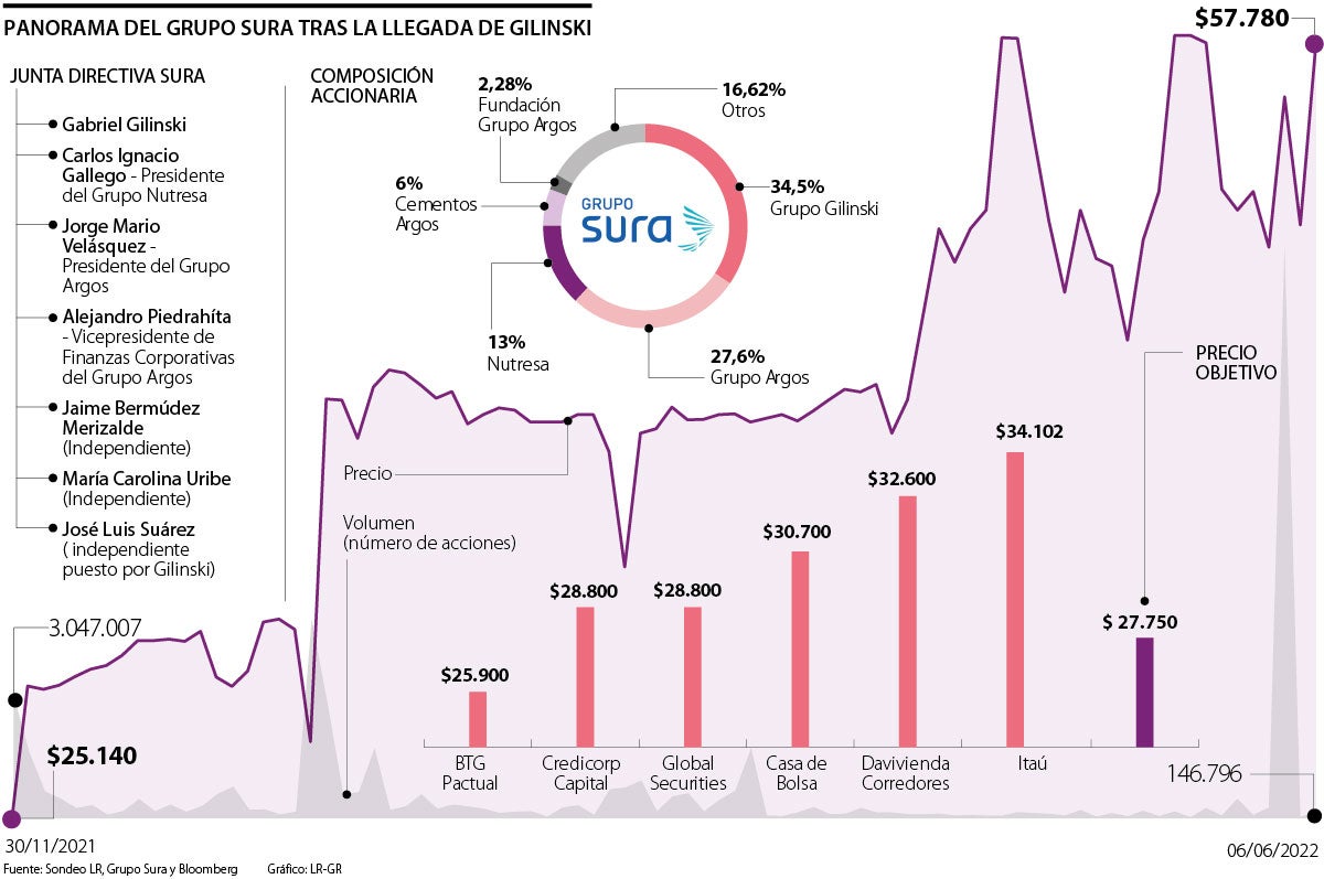 Desde que el Grupo Gilinski presentó la primera OPA por una de las joyas del Grupo Empresarial Antioqueño (GEA), la capitalización bursátil de Grupo Sura ha crecido 139,3%, pasando de $12,3 billones a $29,4 billones. Cuando se analiza este comportamiento en lo corrido del año, la variación total llega a 78%. No obstante, la diferencia entre la cotización actual de la especie ordinaria ($57.780) y la preferencia, es abismal. Esta última tiene un valor actual de $22.500, mostrando una escalada de 20,9% desde noviembre y de 1,4% este año.