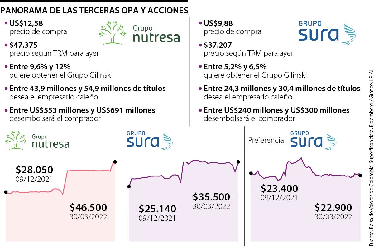 Actualmente, Gilinski tiene 30,8% en Grupo Sura y 31,6% en Nutresa. Sin embargo, de ser exitoso el proceso, los porcentajes podrían aumentar a 37,3% y 43,6%, respectivamente.