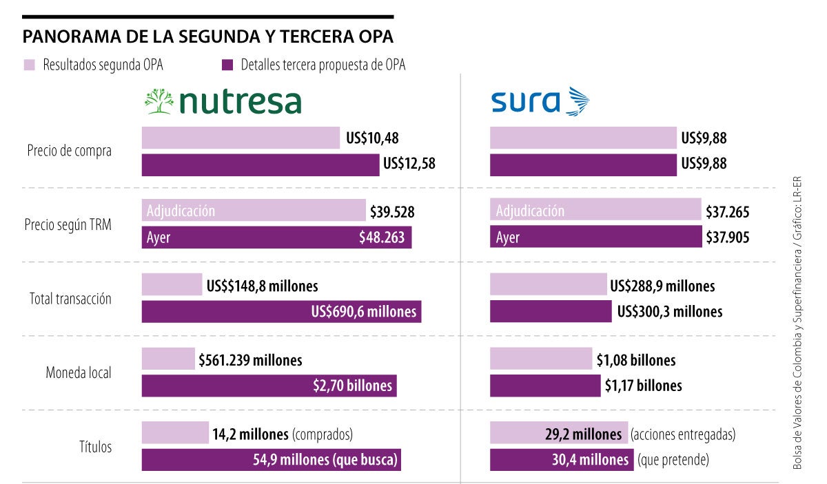Adicionalmente, si se observa el valor de la acción de Nutresa en los libros contables ($17.787), se evidencia que en el mercado público los títulos del emisor se encuentran 148,61% por encima de lo que se contempla corporativamente. Si se compara esta cifra con la de la tercera OPA, la brecha es de 171,3%.