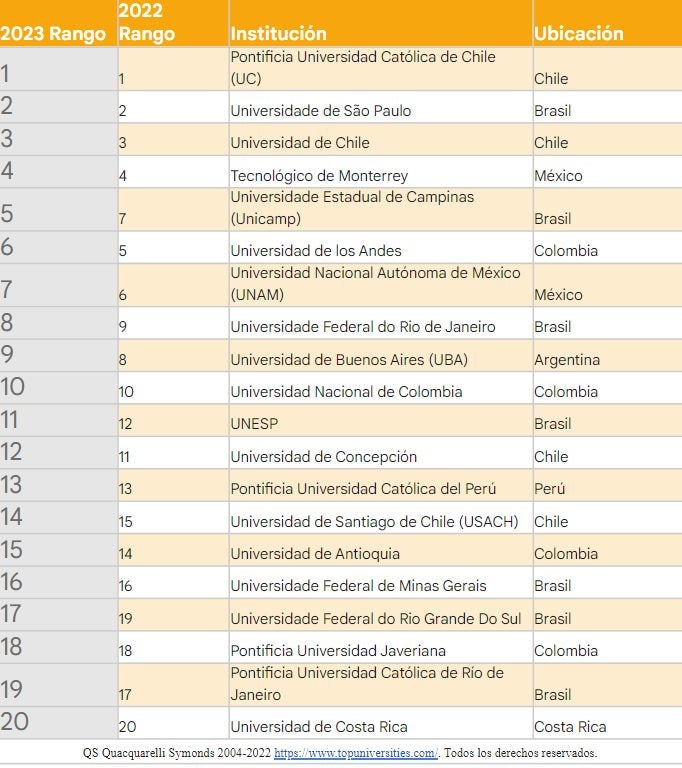 La firma analista de educación superior Quacquarelli Symonds (QS) publicó el ranking QS 2023 de las mejores universidades de América Latina. Tras evaluar categorías como la reputación, redes internacionales de investigación y citaciones por artículos académicos, la Pontificia Universidad Católica de Chile (UC) fue la que se llevó el primer puesto, seguida por la Universidad de São Paulo, la Universidad de Chile, el Tecnológico de Monterrey, y la Universidade Estadual de Campinas (Brasil) cerrando el top cinco.