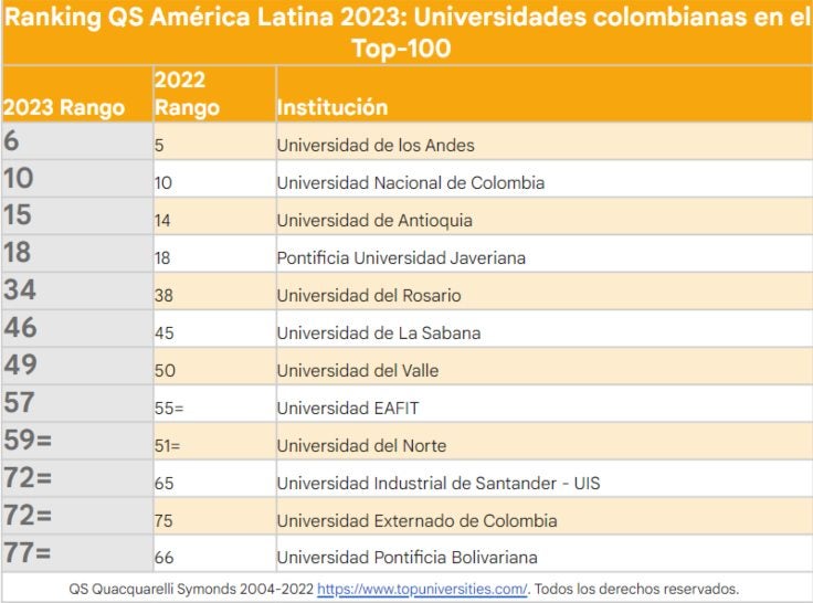 La Universidad de Antioquia quedó en el puesto 15, la Universidad Javeriana en el 18, La Universidad del Rosario en el 34, La Universidad de la Sabana en el 46, y La Universidad del Valle está en el 49.