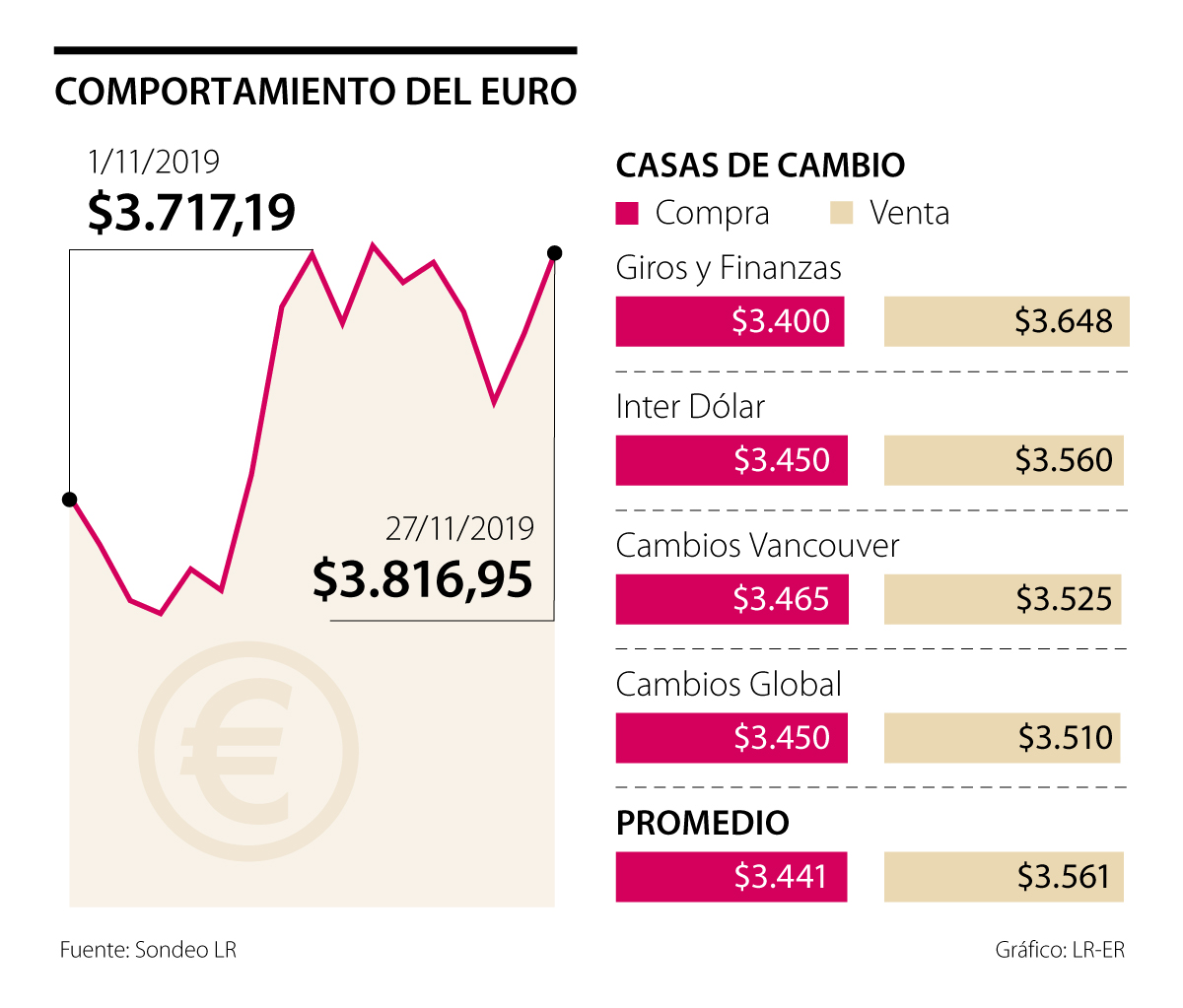 Respecto al comportamiento del euro en las casas de cambio, se debe tener en cuenta que no ha tenido un aumento tan alto en sus precios como el dólar. En compra, por ejemplo, hace tres días se estaba vendiendo a un precio promedio de $3.550 y ahora este valor oscila en $3.561, lo que se traduce en un alza de $11 para los usuarios que quieren comprar esta moneda. Por otra parte, el precio de compra tan solo subió $3,25 en promedio, al pasar de $3.438 el 25 de noviembre a $3.441 el 27 de noviembre.