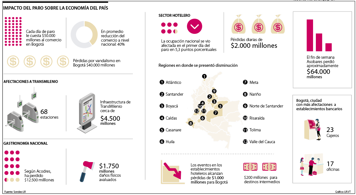 Según Acodres, se han registrado pérdidas de $12.400 millones por menores ventas y en los días más fuertes de vandalismo $1.750 millones por daños a locales y puntos de venta. “Seguimos trabajando y operando, pero cuando hay anuncios de paro nos toca cerrar por la seguridad de nuestros empleados, ha habido cadenas y franquicias que en un solo día han perdido entre $150 y $200 millones”, dijo Henrique París, presidente de Acodres.