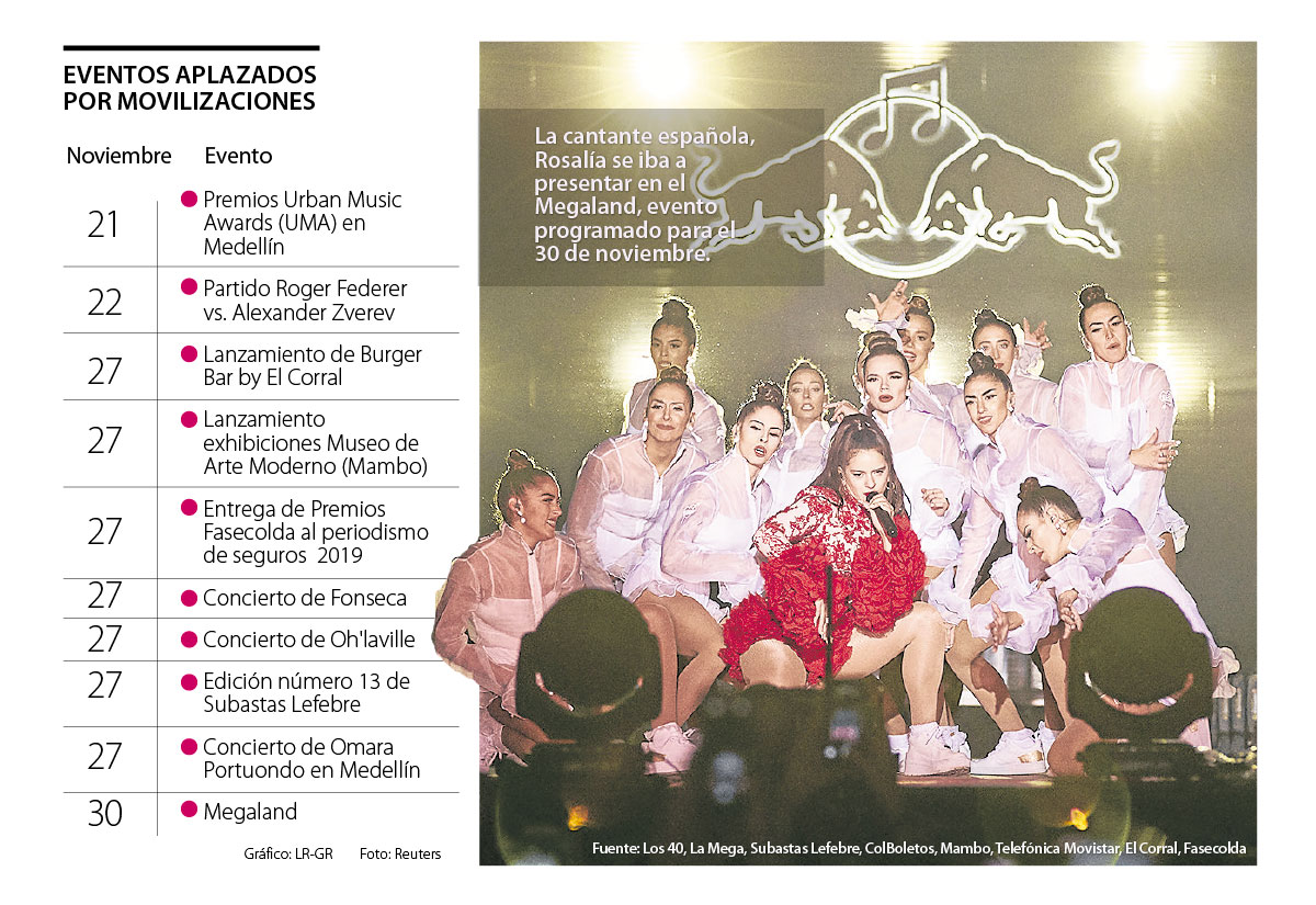 Además del concierto en el que se iba a presentar Rosalía, quien es catalogada como una de las artistas más importantes del momento al obtener cerca de 10 premios durante 2019, otros de los eventos aplazados fue el lanzamiento de ‘Burger Bar’, un evento liderado por El Corral, la presentación de las nuevas exhibiciones que tendrá el Museo de Arte Moderno de Bogotá, el concierto de la agrupación bogotana Oh’laville, la presentación de Fonseca, cuya boletería estaba agotada y hace parte de su gira llamada ‘Simples Corazones’, además de la edición número 13 de Lefebre Subastas, en la que se venderían más 100 piezas de arte.