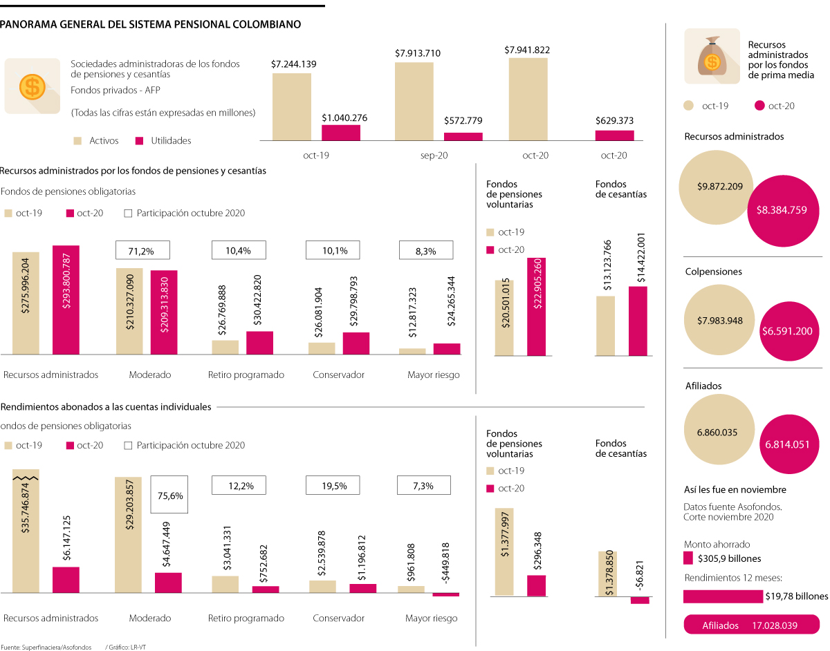 Es importante resaltar que las rentabilidades obtenidas han sido superiores a la rentabilidad mínima que deben garantizar a los afiliados de cada tipo de fondo y más importante, “en octubre se presentaron rendimientos abonados a las cuentas individuales por $6,1 billones, siendo este el tercer mes consecutivo en el que se abonan rendimientos positivos, con fuertes recuperaciones desde marzo, al inicio de la pandemia, cuando las cifras cayeron $21,7 billones”, agrega el informe de la Superfinanciera.