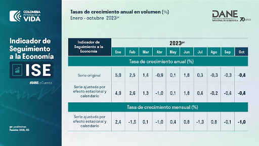 Esto, sin contar que el ISE, Indicador de Seguimiento de la Economía, de octubre registró una variación negativa del PIB en -0,4%, lo que significa que el cuarto trimestre de 2023 inicia con un dato negativo.