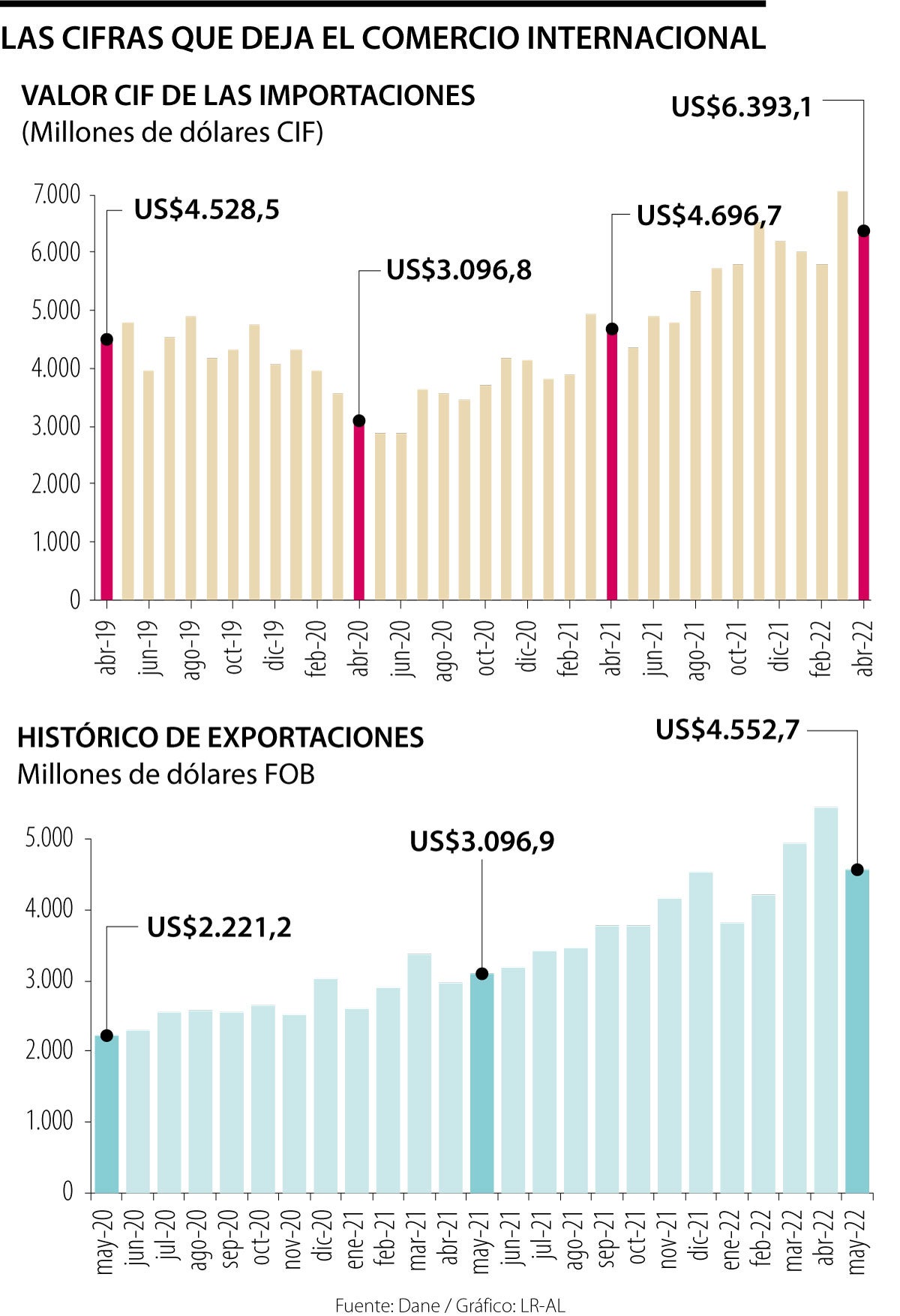 Según el Departamento Administrativo Nacional de Estadística (Dane), en mayo de este año las ventas externas de Colombia alcanzaron US$4.552,7 millones FOB, lo cual representó un aumento de 47% si se compara con el quinto mes del año pasado.