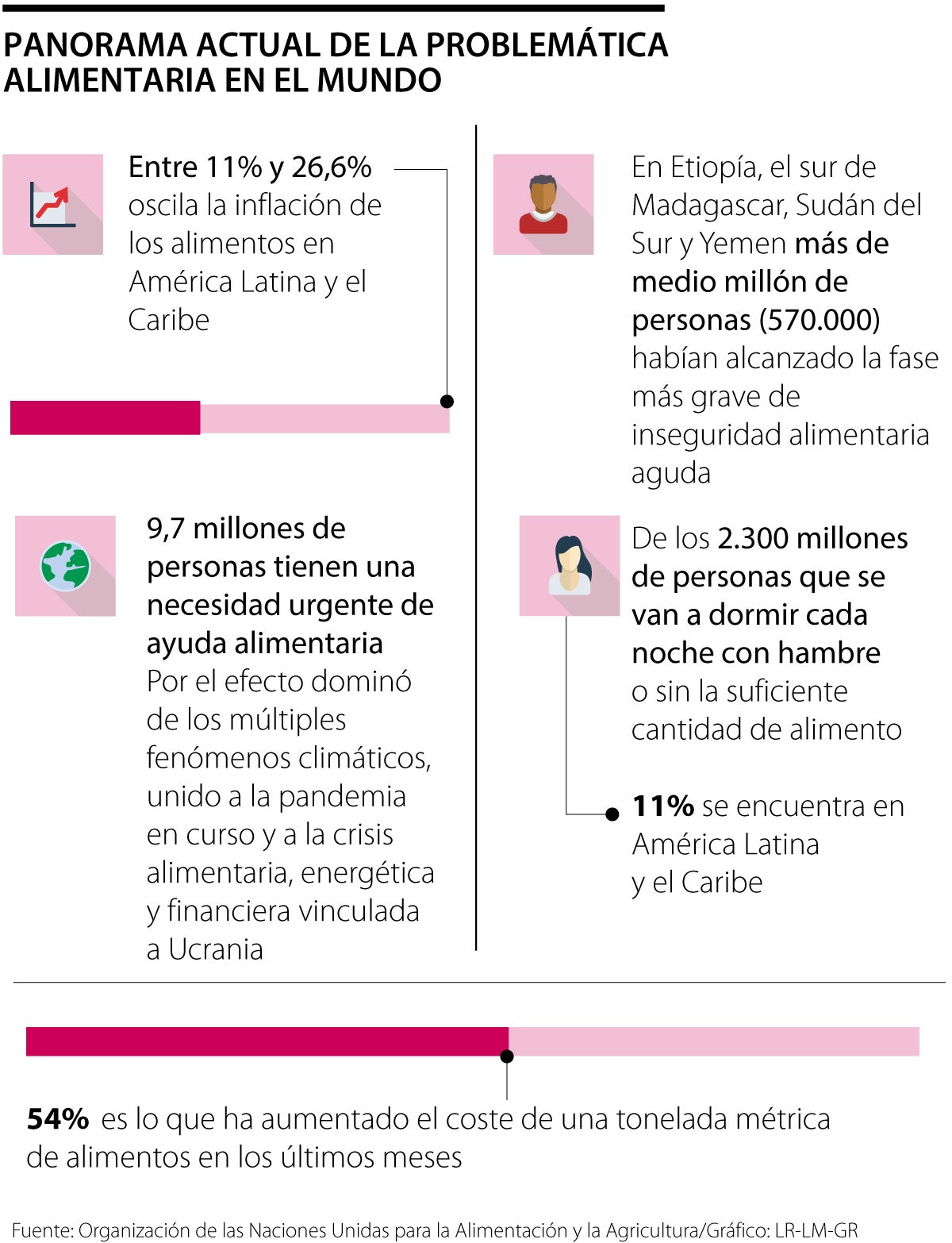 Según un informe de la FAO, 7,3 millones de colombianos tienen en riesgo su seguridad alimentaria durante 2022. Además, para este año, el hambre ganaría terreno en Colombia, incluyendo a los migrantes venezolanos, debido a la combinación de la inestabilidad política, el impacto de la pandemia del covid-19, la crisis migratoria regional y el desplazamiento interno.