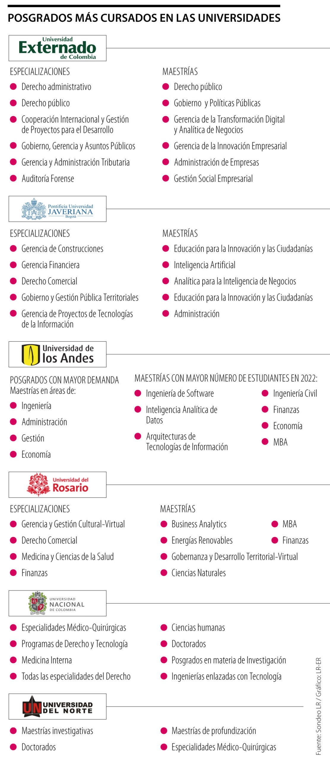 Cada vez más personas con pregrado optan por seguir su formación para tener una hoja de vida más completa y competir en el mercado. Las maestrías y especializaciones son los grados universitarios más buscados y por ello La República consultó a las principales universidades para determinar cuáles son los programas con mayor demanda.