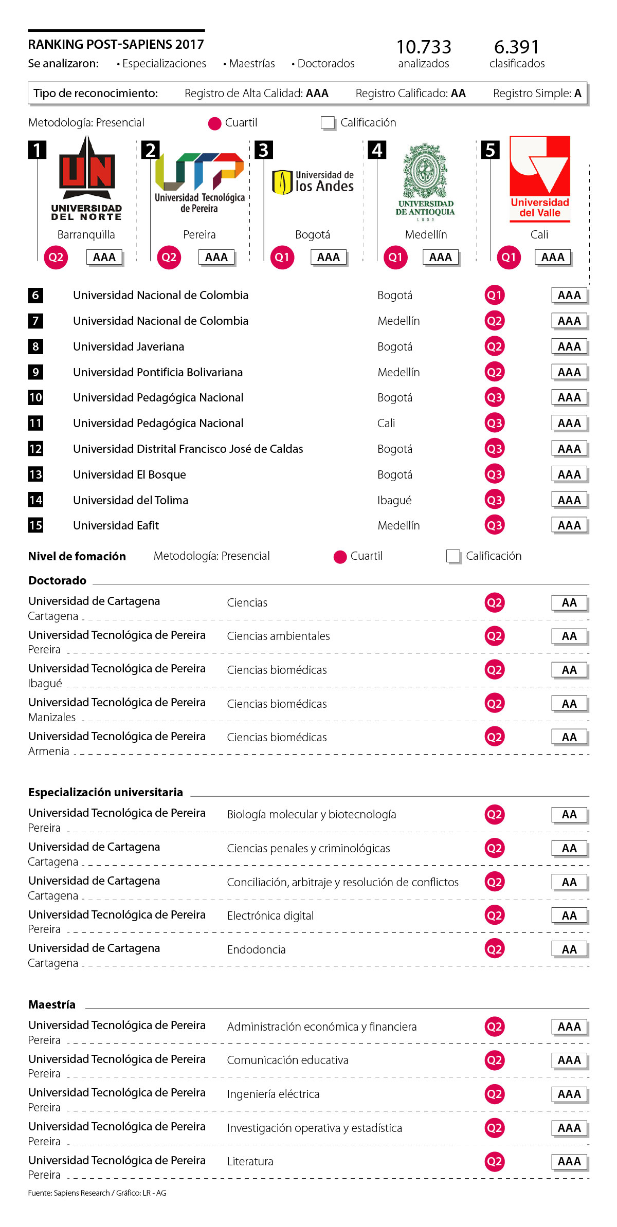 En el Ranking Post-Sapiens de 2017 por Sapiens Research se analizaron 10.733 programas entre maestrías, especializaciones y doctorados y clasificaron 6.391 en total. Además fueron clasificados según el tipo de reconocimiento, Registro de Alta Calidad (AAA), Registro Calificado (AA) y Registro Simple (A).