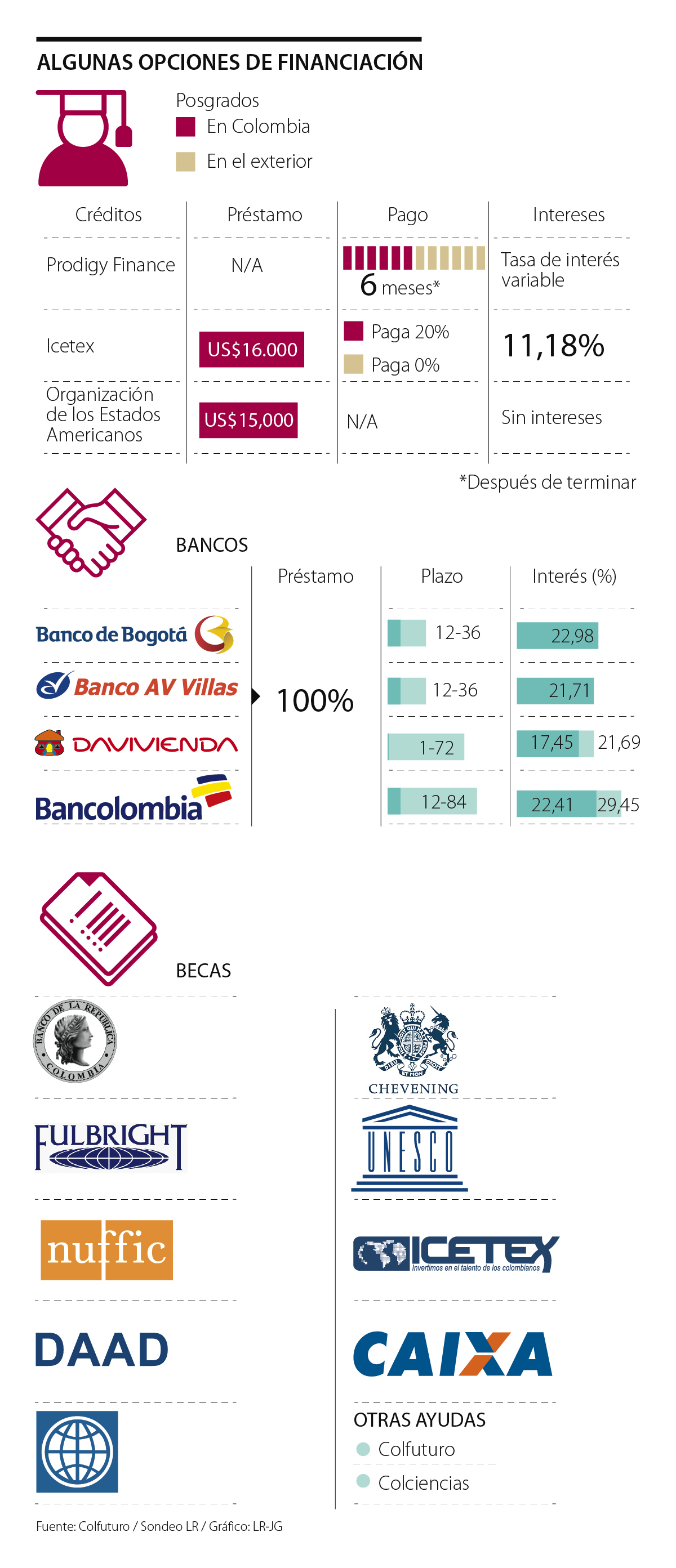 Los bancos son otra alternativa, las tasas de interés varían de acuerdo a la entidad así como el tiempo para saldar la deuda. Ana María Barbosa, gerente de Producto de Consumo del Banco de Bogotá, afirmó que “otorgar créditos de posgrados garantiza que los colombianos puedan acceder y terminar sus programas de educación superior. Actualmente contamos con más de 90 convenios con las mejores universidades del país”.