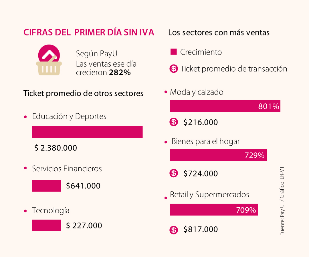 De acuerdo con un análisis realizado por la empresa PayU, que estuvo ofreciendo a los comercios su servicio, la primera versión del día sin IVA dejó un crecimiento de 282% “en comparación a un día de venta promedio”.